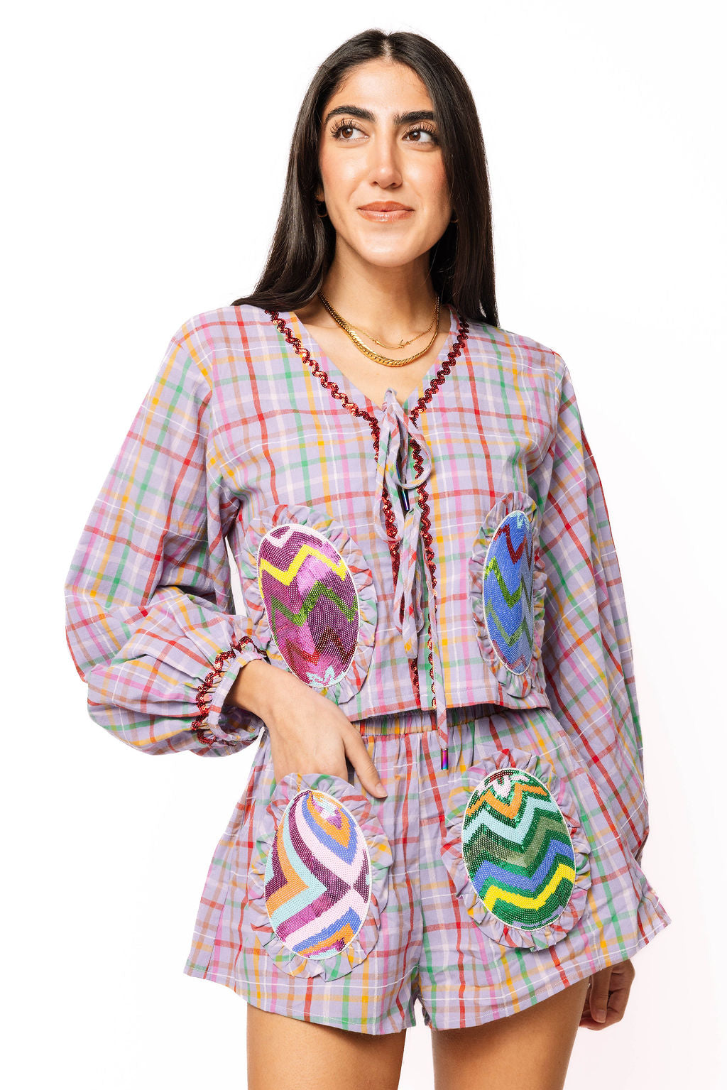 Sample Purple Plaid Ruffle Sequin Easter Egg Tie Top & Short Set