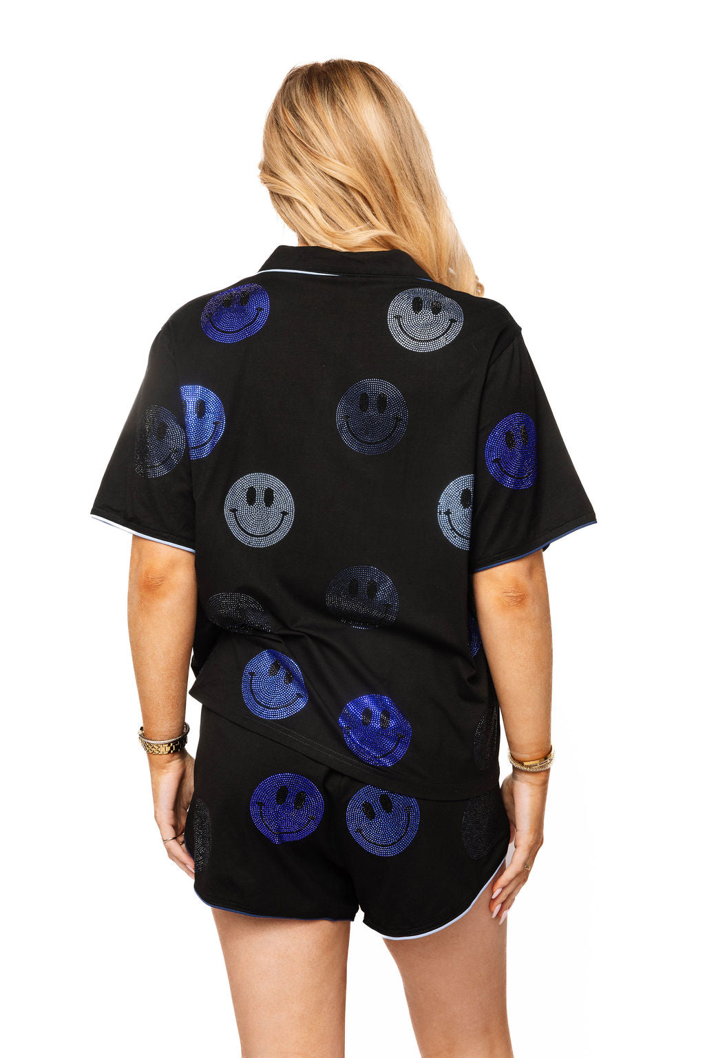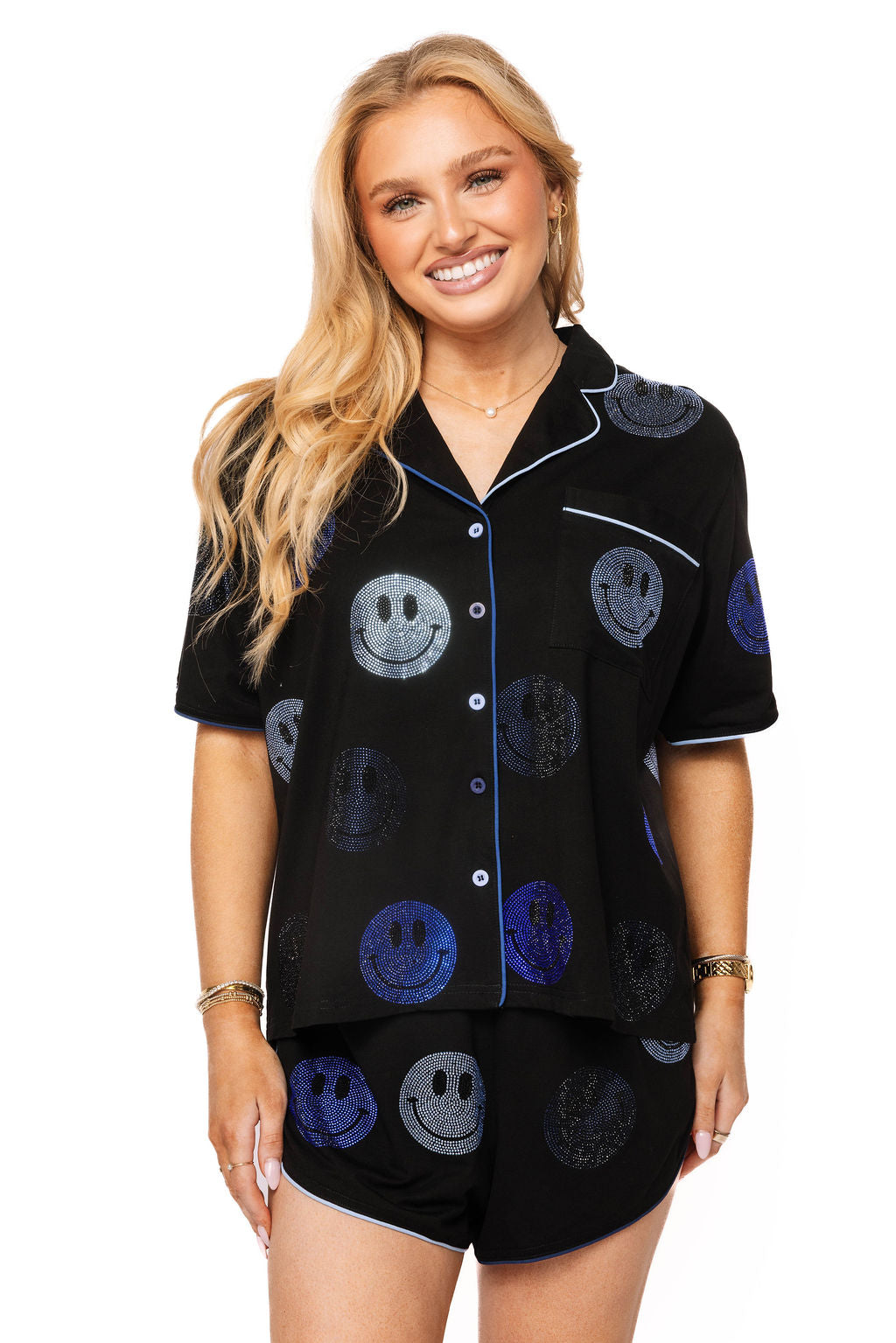 The Sample Black With Royal, Navy & Light Blue Rhinestone Smiley Face PJ Set offers a unique blend of comfort and style. Crafted from soft, breathable fabric, these pajamas ensure a cozy night's sleep. The eye-catching smiley face design, adorned with rhinestones, adds a touch of playful elegance, making it suitable for both lounging and sleep.