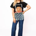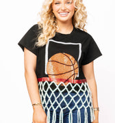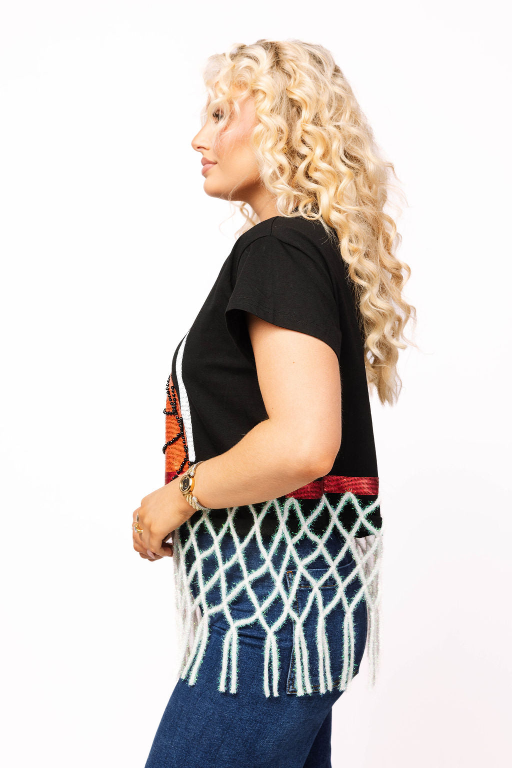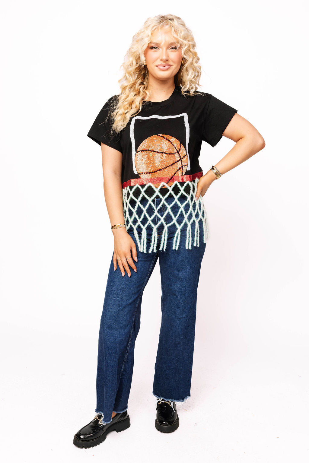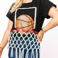 Shoot hoops in style with this playful black tee featuring a rope basketball net design wrapped around the bottom. Perfect for court enthusiasts and casual athletes who want to show off their love for the game without breaking a sweat. The unique net detail adds a fun, sporty twist to your everyday wardrobe.