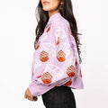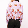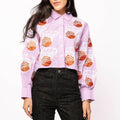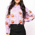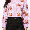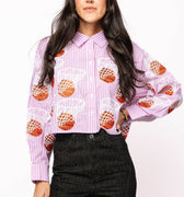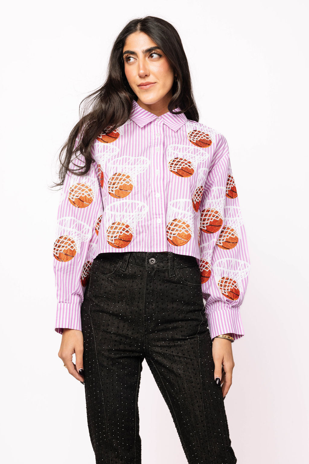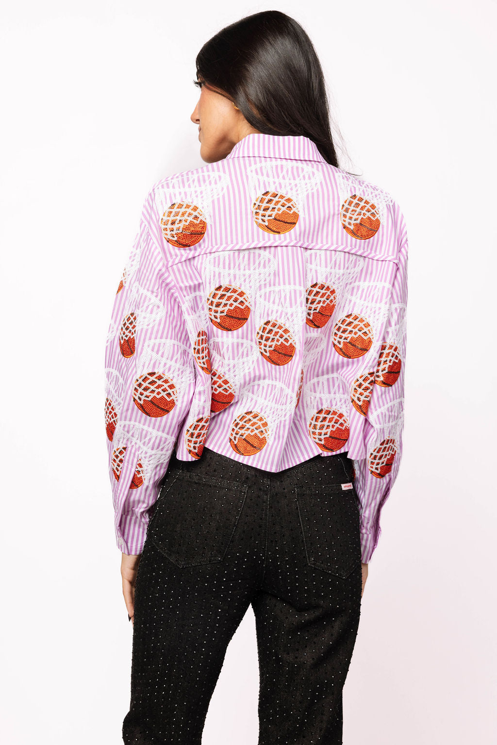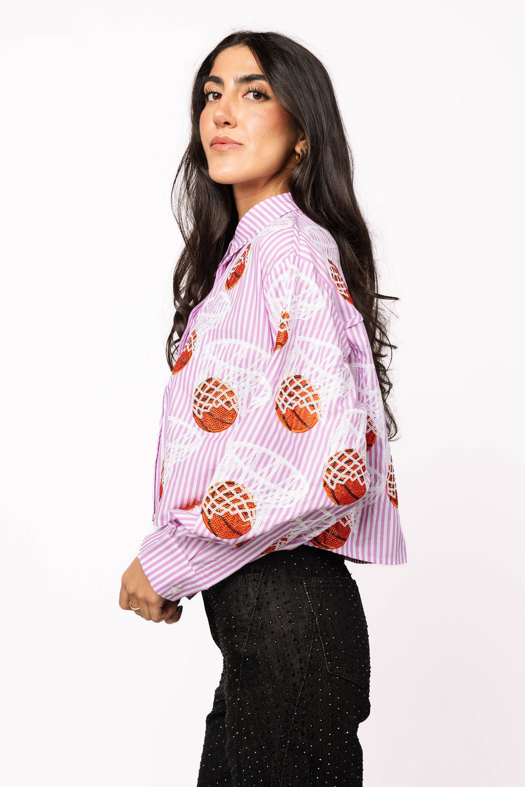 Shoot hoops in style with this playful lavender and white striped button-up top featuring an all-over basketball and hoop design. Perfect for court-side vibes or casual game day looks, this piece brings sporty fun to your wardrobe.