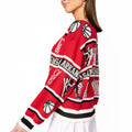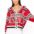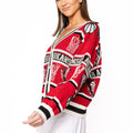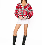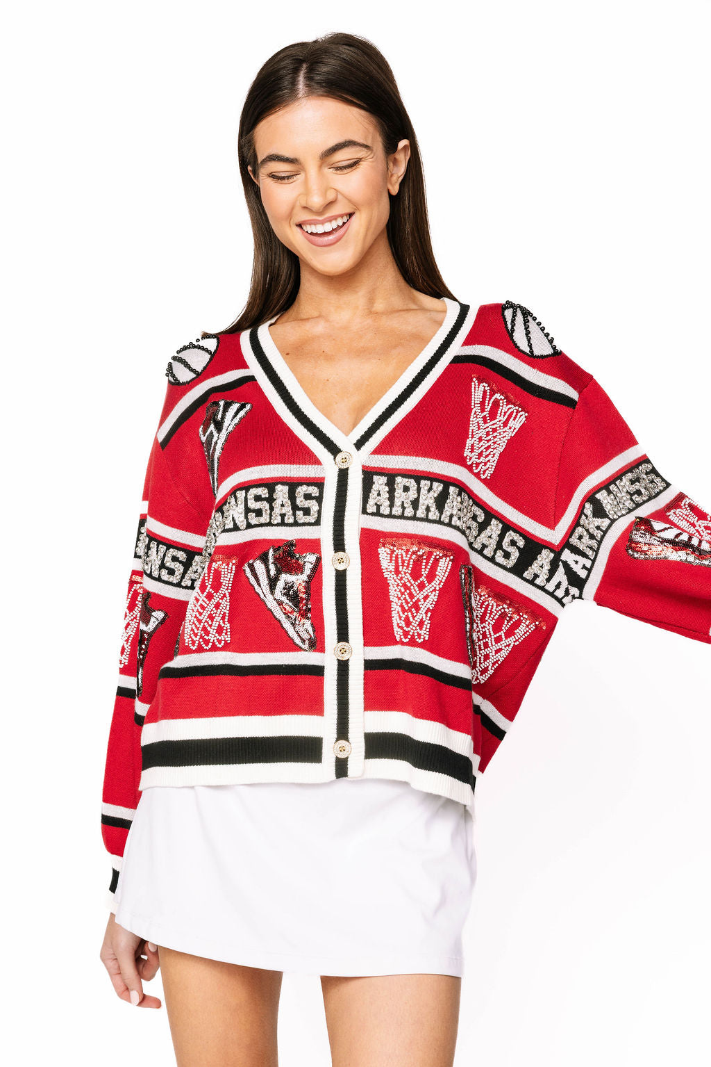 Show your Razorback pride in style with this licensed Arkansas basketball cardigan featuring bold red and black stripes and a sparkling rhinestone basketball icon. Perfect for game day, whether you're cheering from the stands or catching the action courtside, this piece combines team spirit with eye-catching glamour. The comfortable cardigan silhouette makes it ideal for layering during those exciting moments when you can't help but jump to your feet. Celebrate your love for Arkansas basketball with a touch of sparkle!