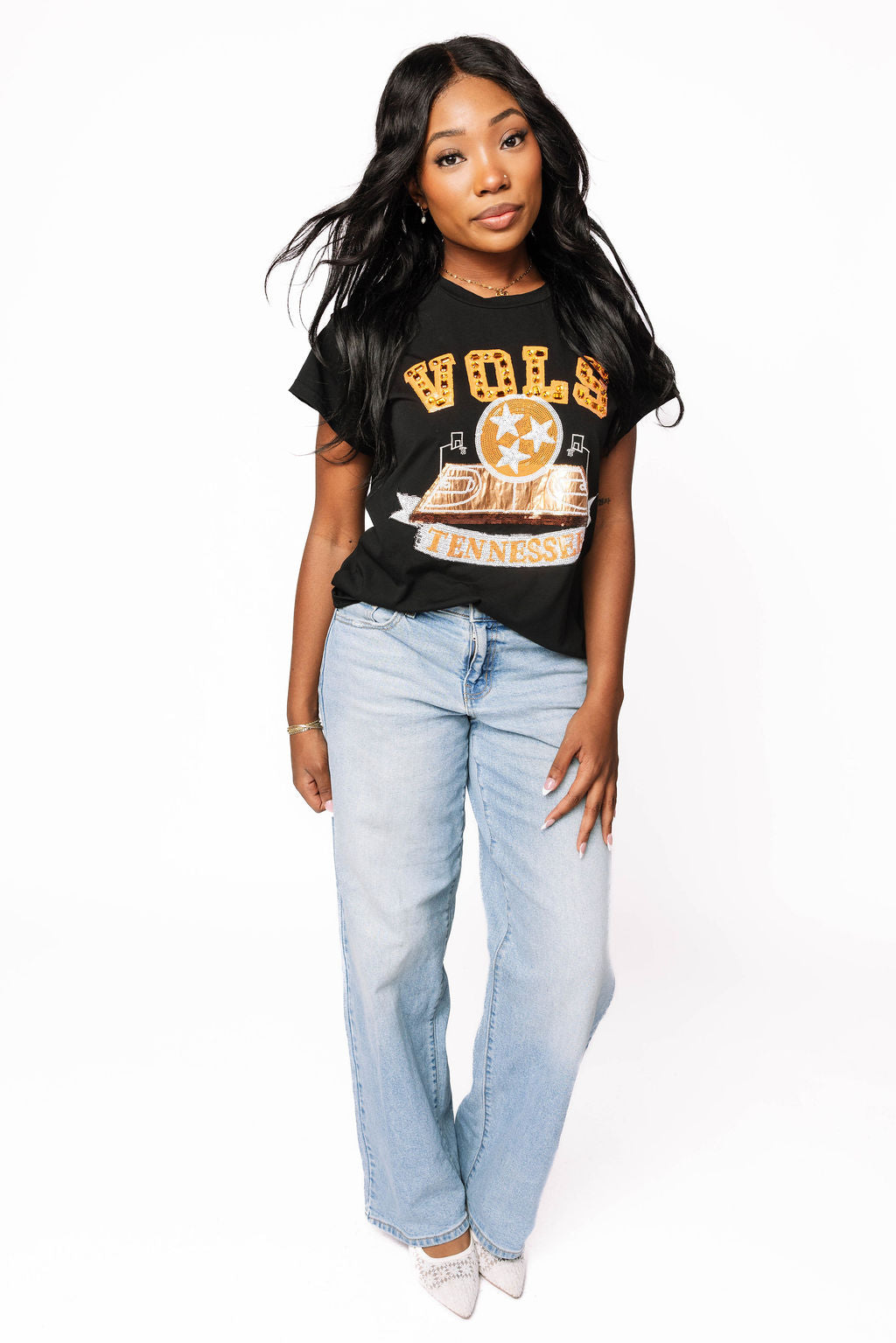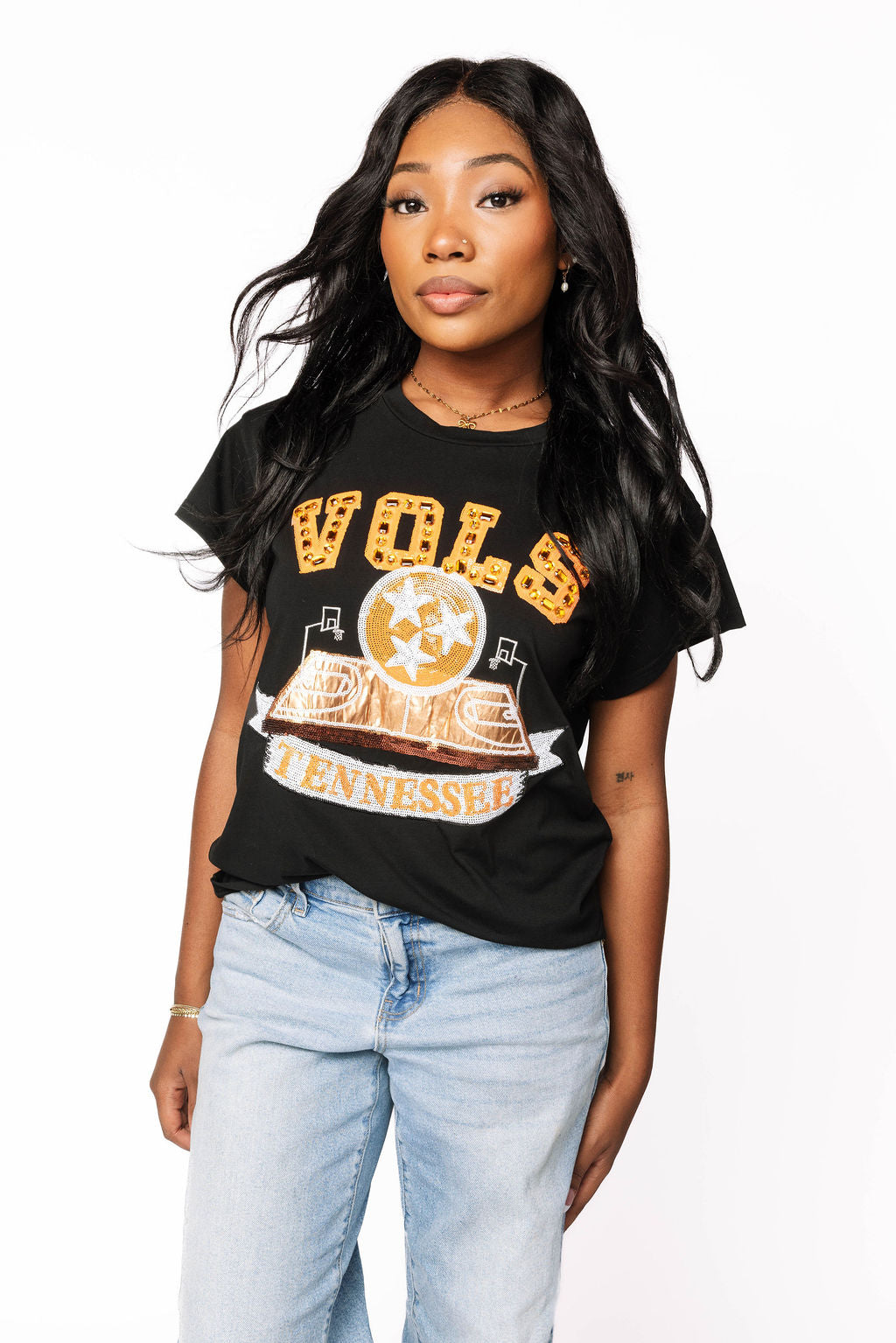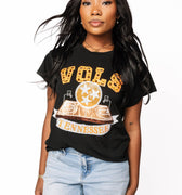 Rock your Tennessee pride with this officially licensed basketball court tee! Featuring bold court-inspired graphics on classic black, it's the perfect way to show your team spirit whether you're courtside or just vibing with fellow fans. Soft, comfortable, and ready for game day or everyday wear—because true fans rep their squad 24/7.