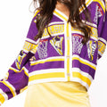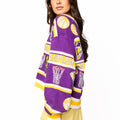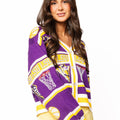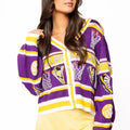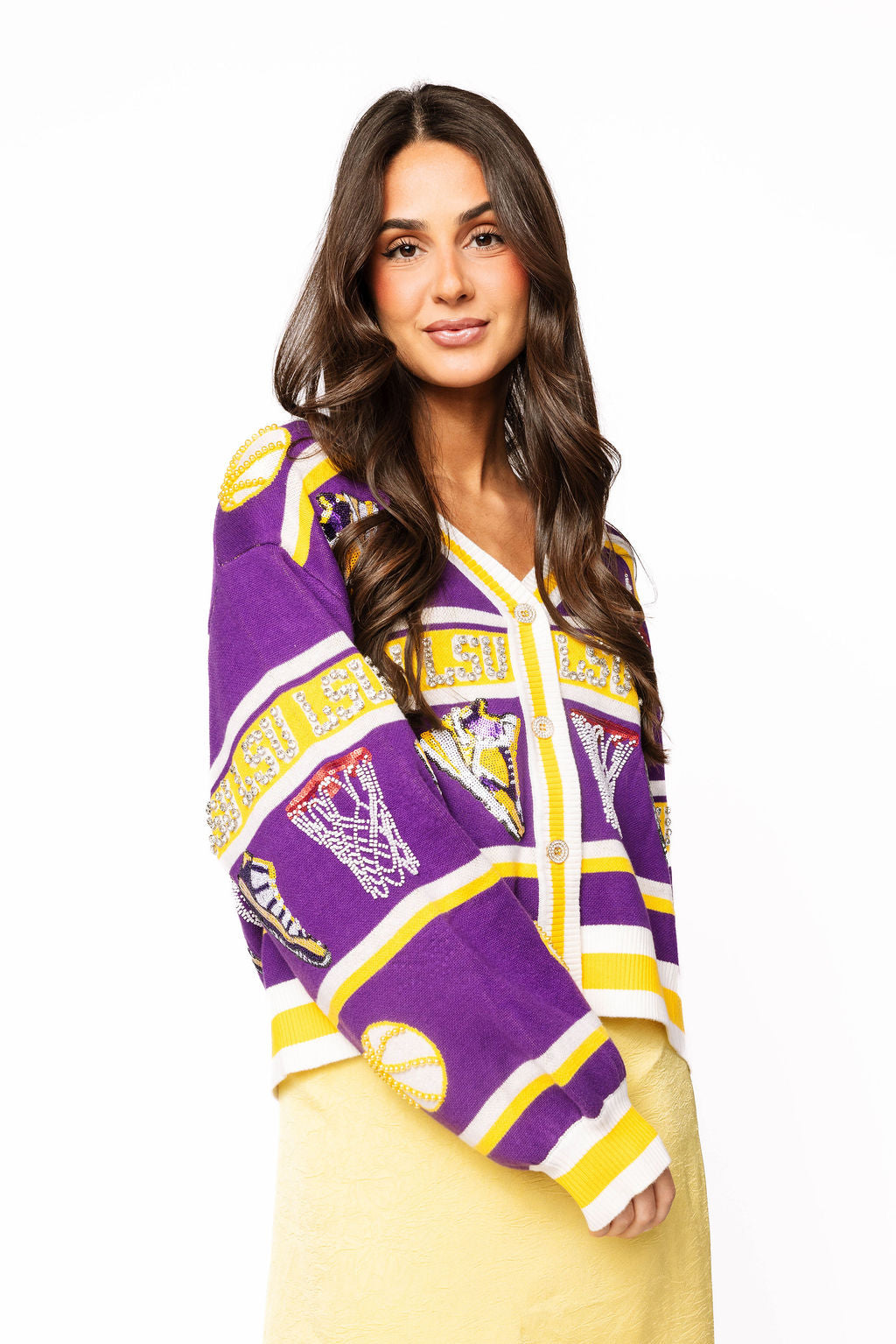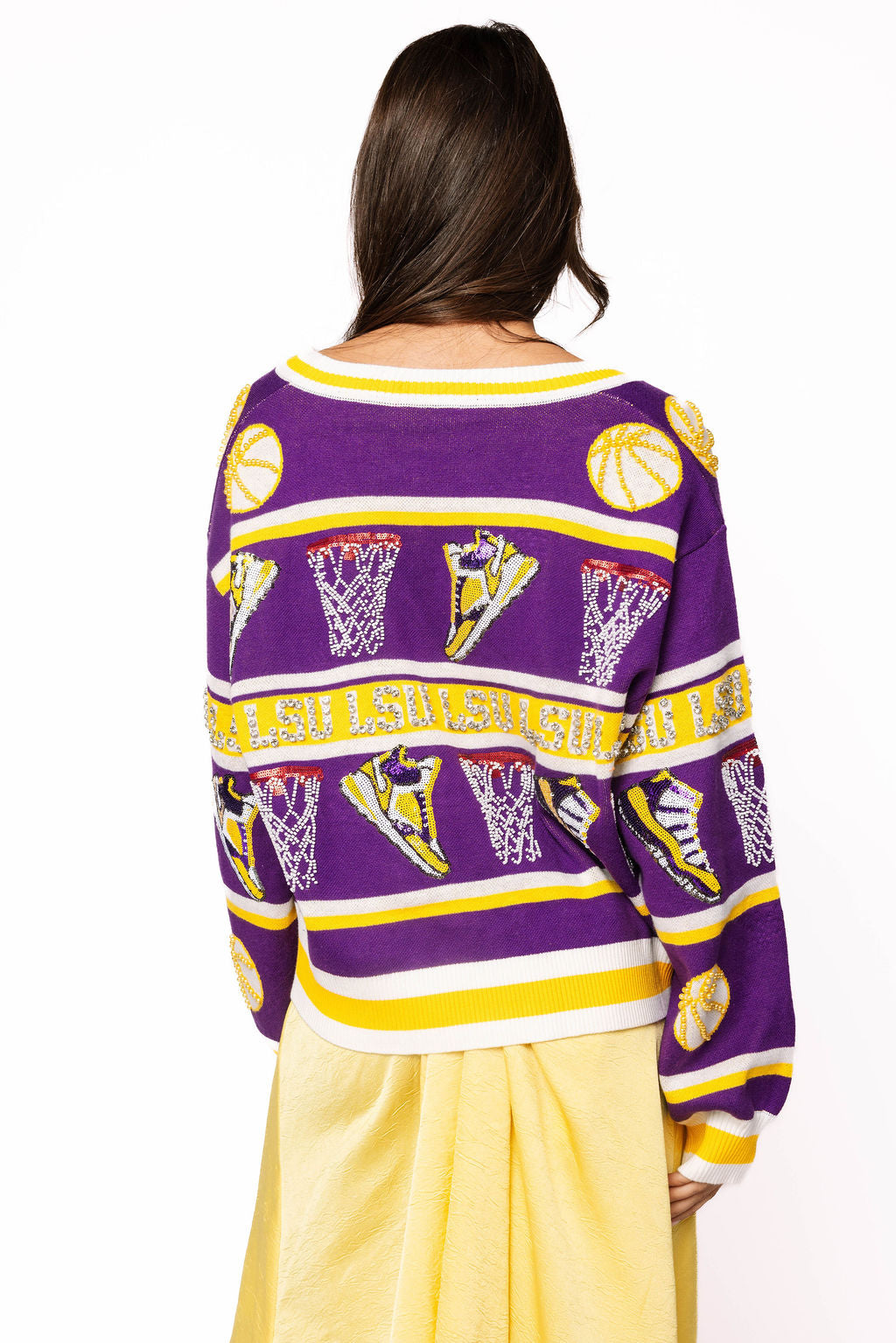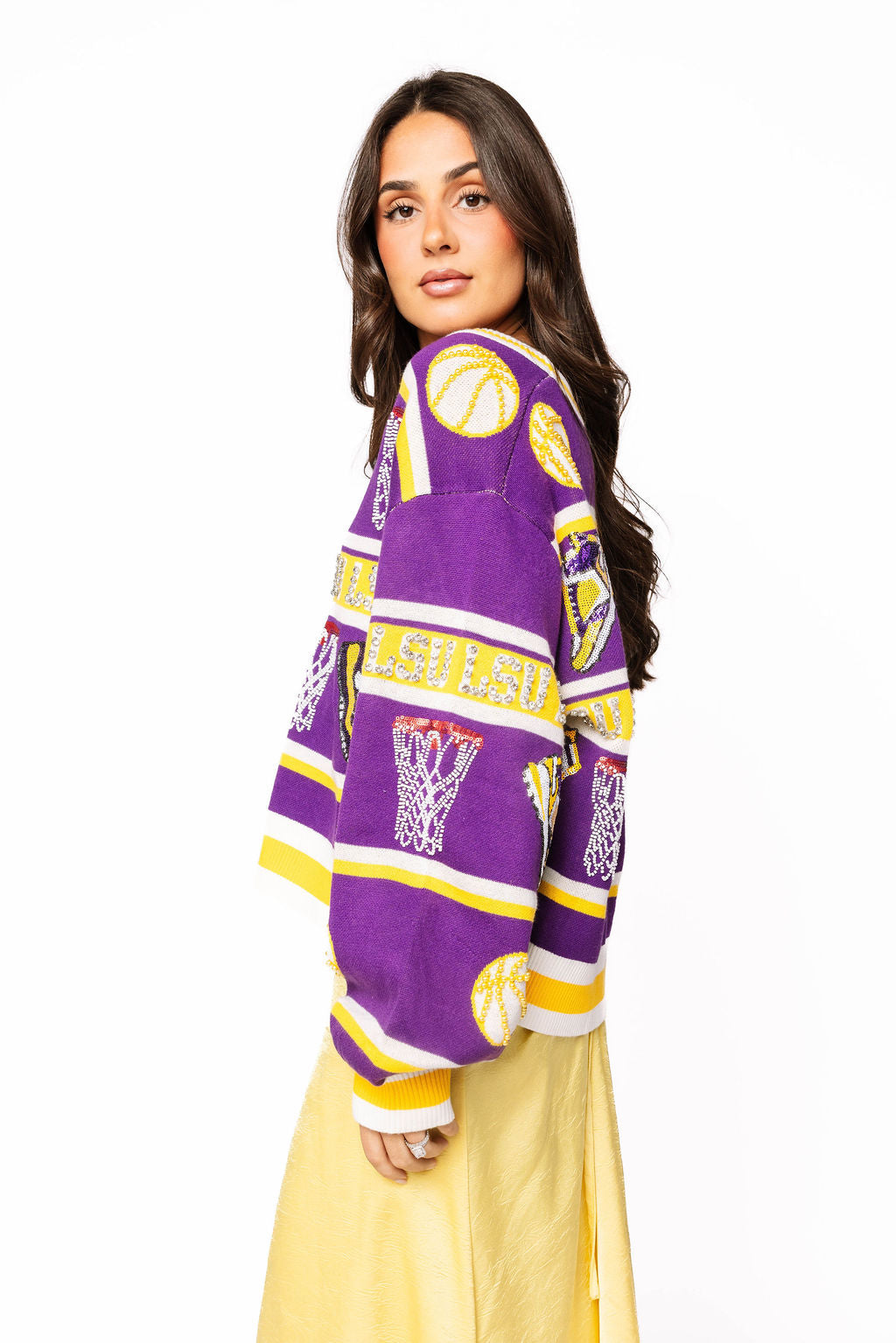 Game day just got a whole lot more glamorous! This LSU striped basketball cardigan combines school spirit with serious sparkle, featuring rhinestone-embellished icons that catch the light with every move. The purple and gold colorway celebrates your Tigers pride in style, while the relaxed cardigan silhouette keeps you comfortable whether you're cheering from the stands or showing support around town. Perfect for layering over game day outfits or dressing up casual looks with a touch of bling.