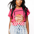 Shoot hoops in style with this playful pink tee featuring a rope basketball net design wrapped around the bottom. Perfect for court enthusiasts and casual athletes who want to show off their love for the game without breaking a sweat. The unique net detail adds a fun, sporty twist to your everyday wardrobe.