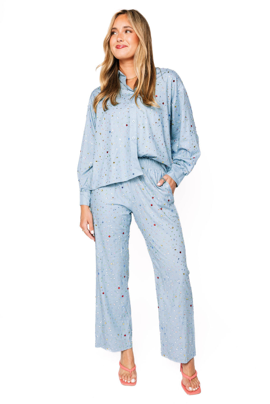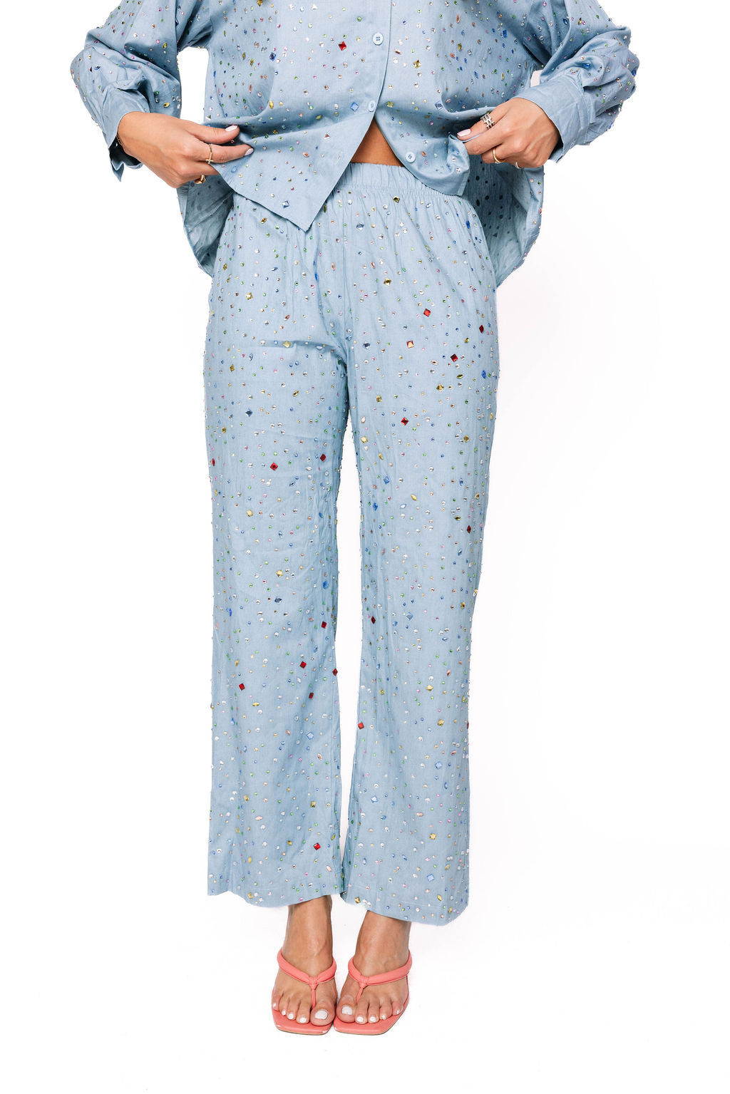 Dive into effortless sparkle with these chambray pants featuring an elastic waistband for all-day comfort and a dazzling cascade of multicolor rhinestones that catch every light. The relaxed fit makes them perfect for casual outings, while the jeweled detailing elevates your everyday style. Mix and match with our coordinating rhinestone top to create a head-turning ensemble that's equal parts fun and fabulous. Your go-to piece for adding instant glam to any wardrobe.