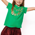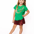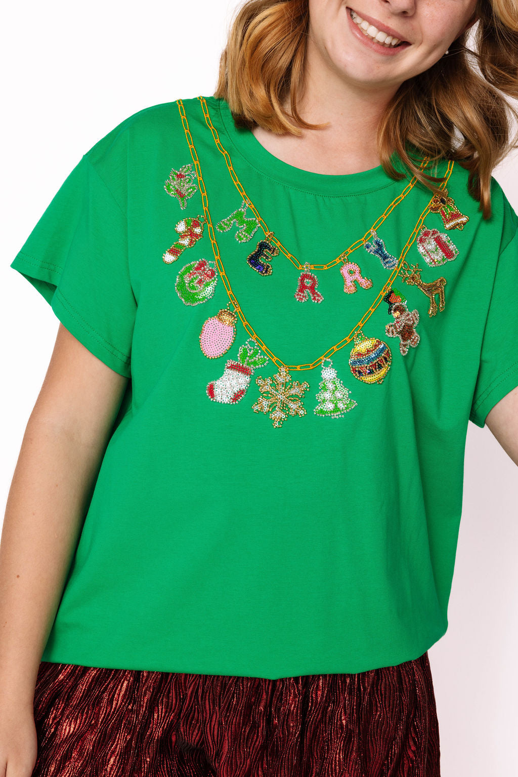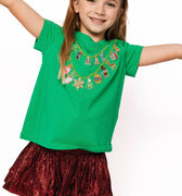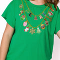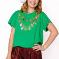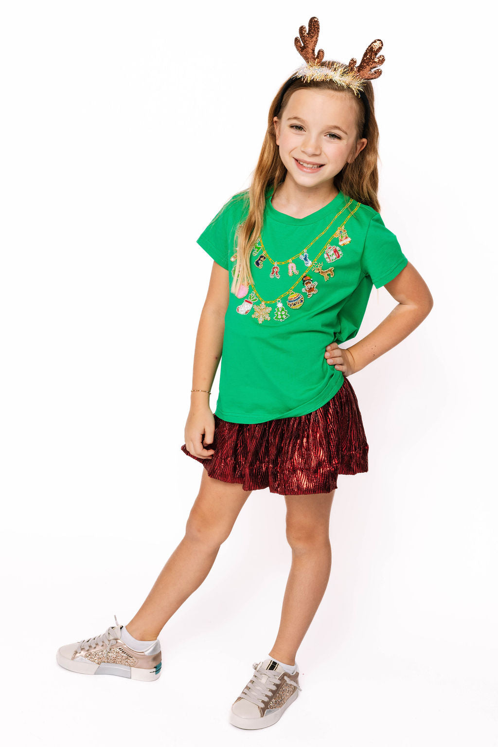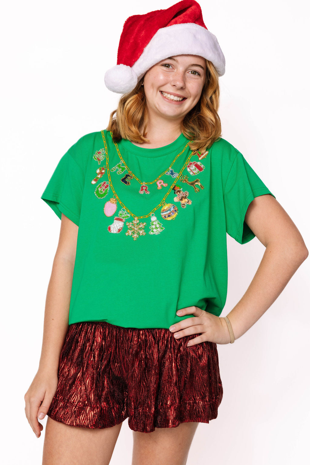 This cheerful green tee brings holiday fun to life with its playful Christmas charm necklace design. Perfect for kids, it adds a festive touch to any outfit with colorful icons that celebrate the season. Soft and comfortable, it’s great for holiday parties, school events, or everyday winter wear. Let your little one sparkle with festive joy in this delightful tee!