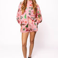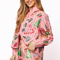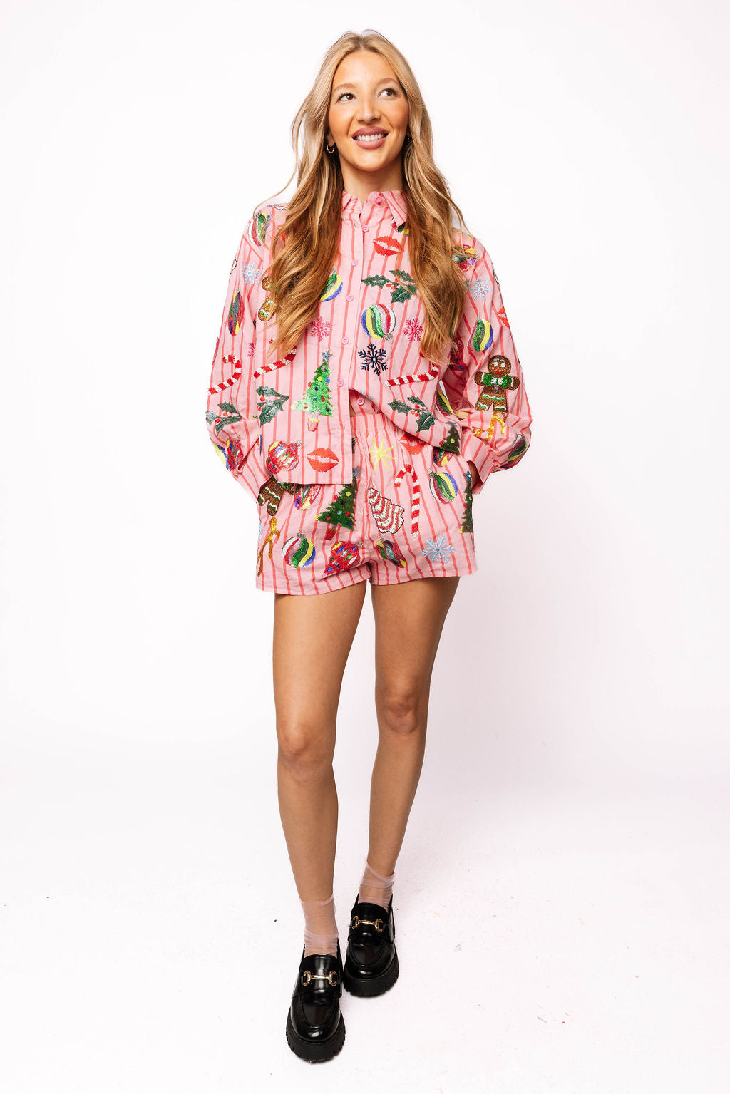 These light pink cotton shorts feature a bold red stripe and sparkling sequin Christmas icons, perfect for adding holiday cheer to your outfit. Comfortable and festive, they pair perfectly with the matching top for a fun, coordinated look that shines bright at any holiday gathering.