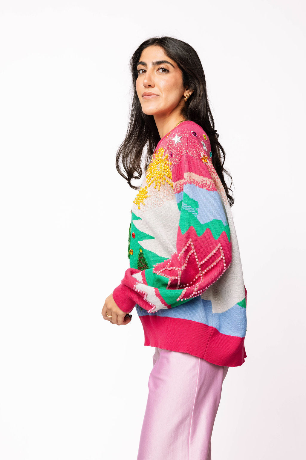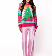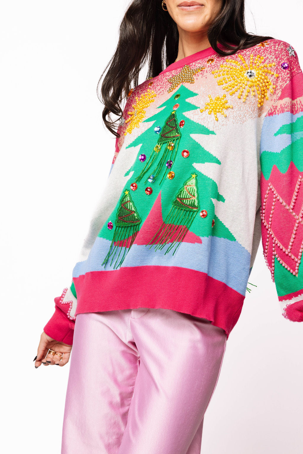 Celebrate the season in style with this playful Multi Pearl Fringe Christmas Tree Sweater! Adorned with sparkling jewels, delicate pearl accents, and charming bead fringe, this slightly oversized sweater brings festive fun and shimmer to your holiday wardrobe. Cozy, eye-catching, and full of delightful details—you’ll be the sparkle of every celebration!