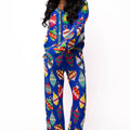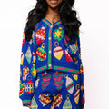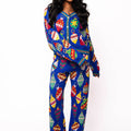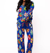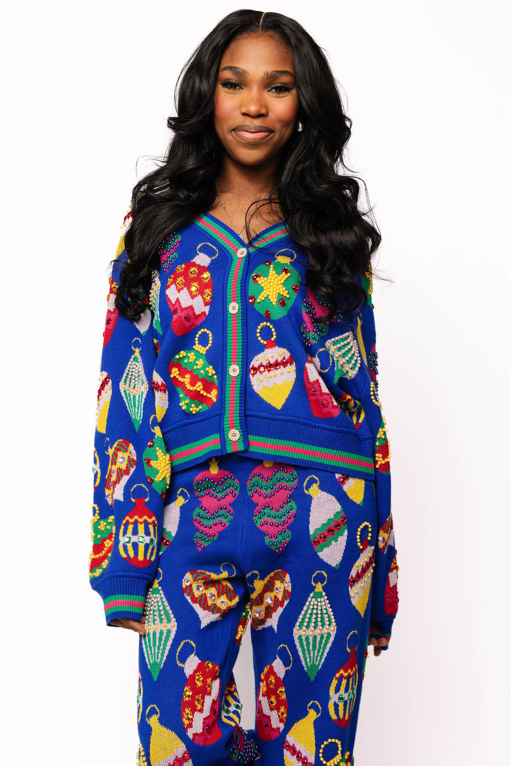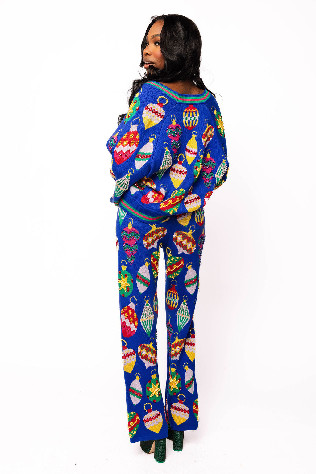 Get ready to sparkle this season in our Royal Blue Multi Jeweled Ornament Pant! These cozy sweater pants are decked out in festive ornament designs, making them the ultimate holiday statement. Pair them with the matching cardigan for a merry and stylish look that’s as playful as it is comfortable. Perfect for lounging or holiday gatherings, these pants bring cheer and charm wherever you go.