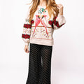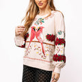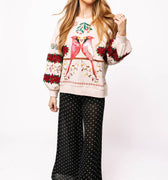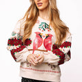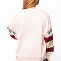 Get into the festive spirit with this beige sweatshirt showcasing two sweet cardinals kissing under the mistletoe! Detailed poinsettias decorate the sleeves, while colorful Christmas lights add extra holiday magic. Cozy and whimsical, it’s the perfect way to celebrate in style and comfort.