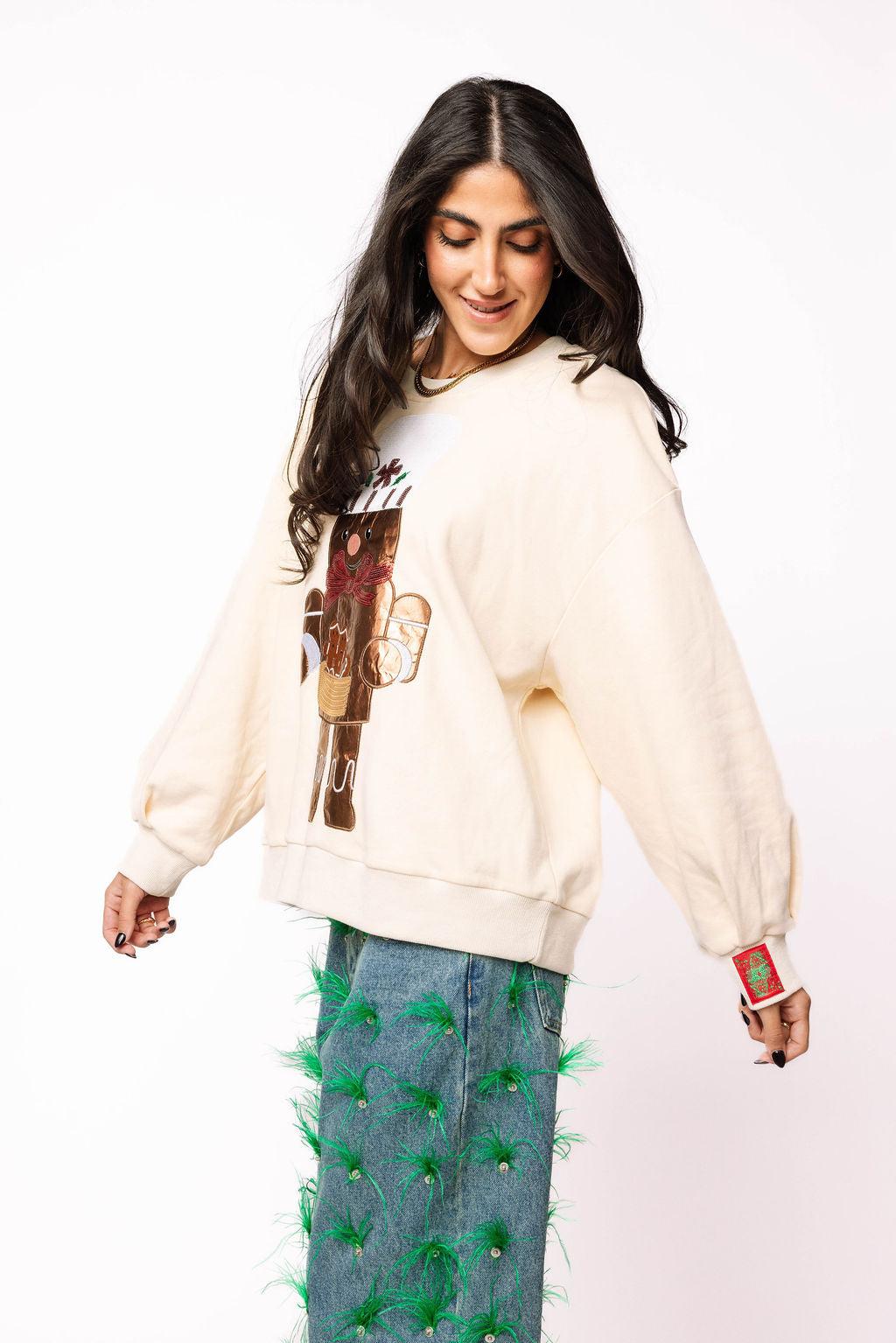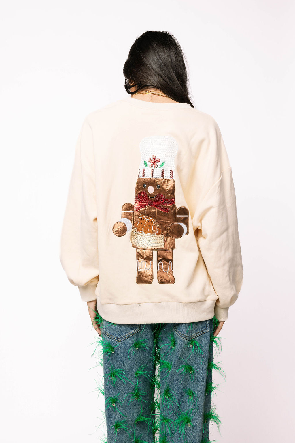 Add a little sweet sparkle to your cozy days with the Beige Metallic Gingerbread Man Sweatshirt. Its playful metallic gingerbread design brightens up any outfit while keeping you warm and comfy. Perfect for festive fun or everyday wear, this sweatshirt blends comfort with a dash of holiday cheer.