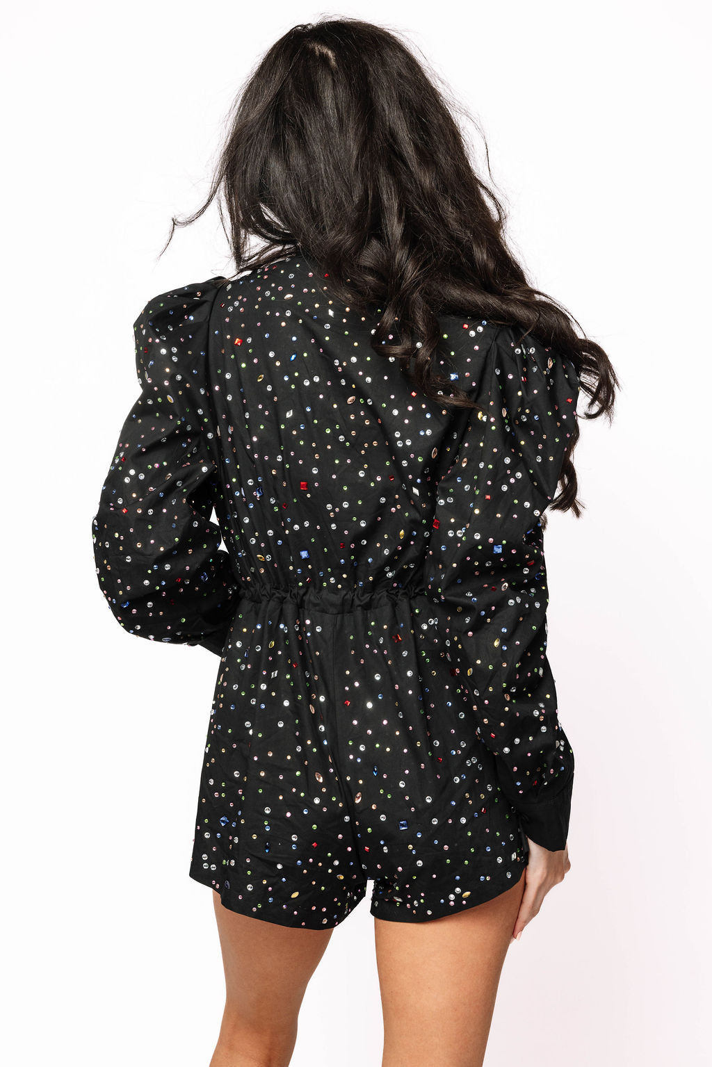 Black Multi Scattered Rhinestone Long Sleeve Romper