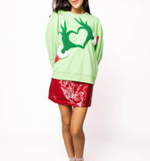 Celebrate the holiday season with a twist of fun wearing the Green Grinch Heart Hands Sweatshirt. Its vibrant green color and charming heart-shaped hands design bring a playful charm to your cozy wardrobe. Perfect for festive gatherings or casual winter days, this sweatshirt keeps you comfortable while spreading mischievous holiday cheer.