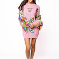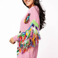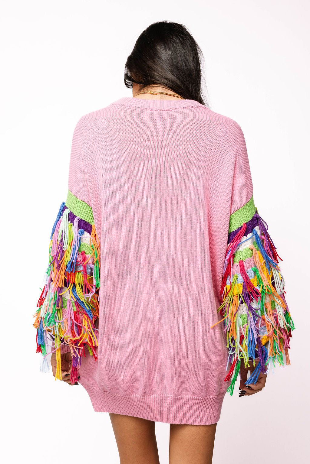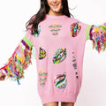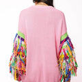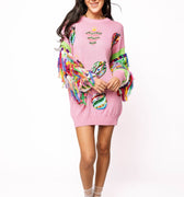 Embrace fun and flair with this pink sweater dress featuring dazzling jeweled ornament details and vibrant multicolor fringe along the long sleeves. Perfect for those who love to stand out, this dress combines cozy comfort with eye-catching style for a playful, chic look wherever you go.
