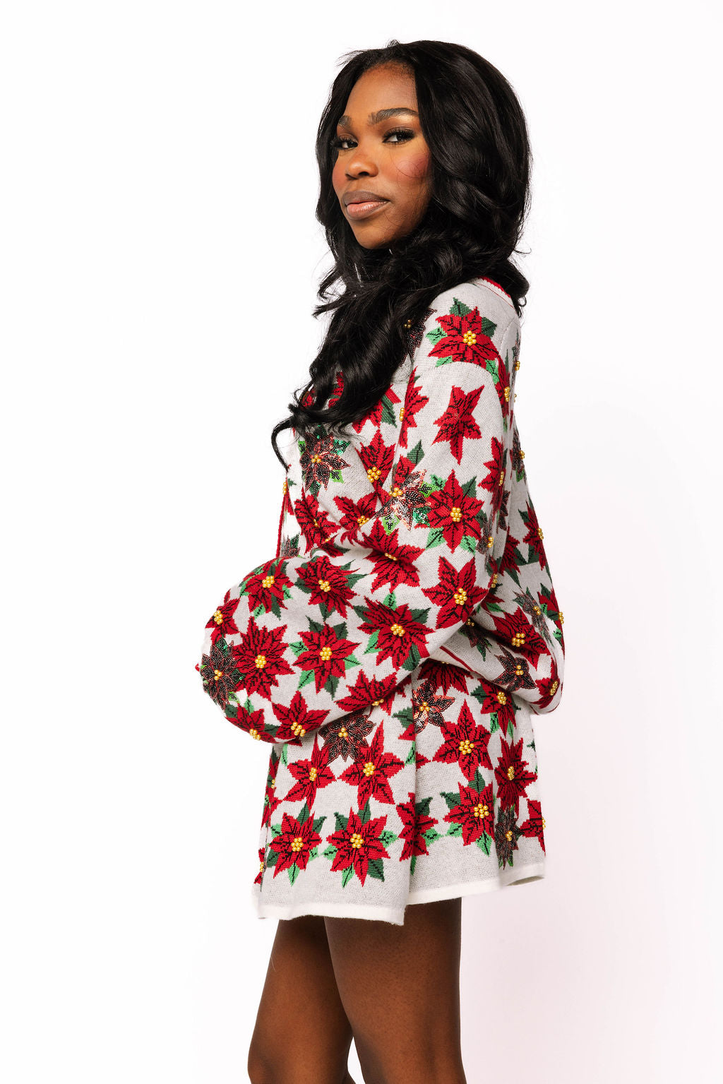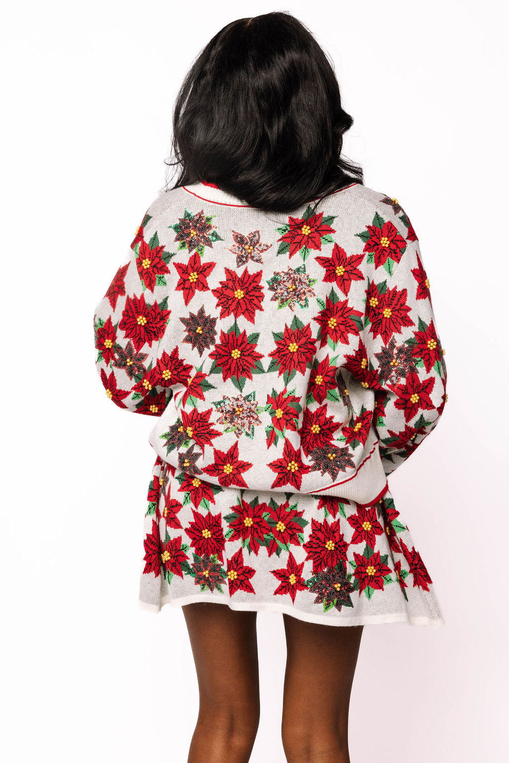 Celebrate the season in style with this White & Red Poinsettia Knit Skirt! Cozy and festive, this skirt features a charming poinsettia pattern that brings holiday cheer to any outfit. The soft knit fabric keeps you comfortable while adding a playful pop of color to your winter wardrobe. Perfect for twirling under the mistletoe or brightening up festive gatherings!