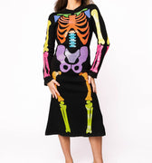 Turn heads and spark conversations with the Black Multi Sequin Skeleton Knit Midi Dress. This playful design blends edgy skeleton motifs with shimmering sequins for a dazzling, spooky-chic look. Perfect for parties or nights when you want to shine with a touch of fun and mystery. Its knit fabric ensures a comfortable fit that moves with you, making it as wearable as it is unforgettable.
