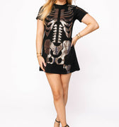 Embrace your edgy side with the Black Multi Skeleton Body Tee Dress. This playful piece hugs your curves while showcasing a bold skeleton print that adds a fun twist to your outfit. Perfect for days when you want to stand out with a touch of spooky charm and effortless style.