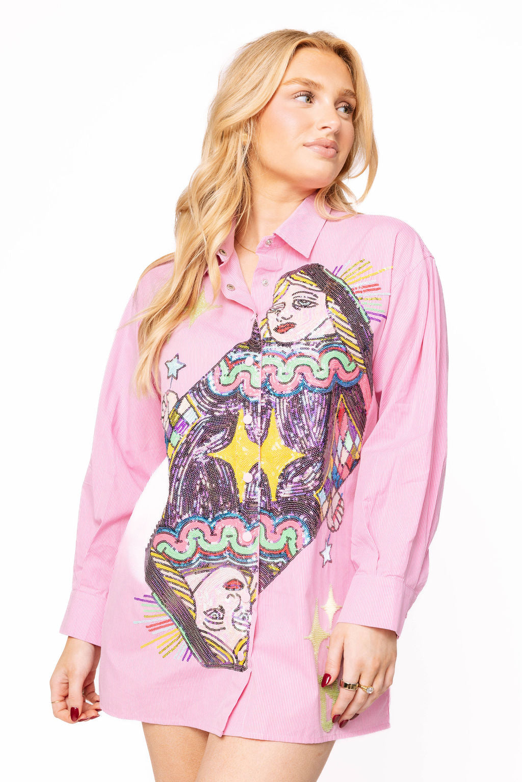 Step into sparkle mode with this pink button-up dress featuring the iconic Queen of Sparkles sequin logo on the chest. Crafted from soft cotton for all-day comfort, it pairs a classic collar with a fun, eye-catching design that screams confidence. Perfect for casual outings or making a statement wherever you go. Dress it up or down—this playful piece is your new go-to for effortless style with a touch of glam.