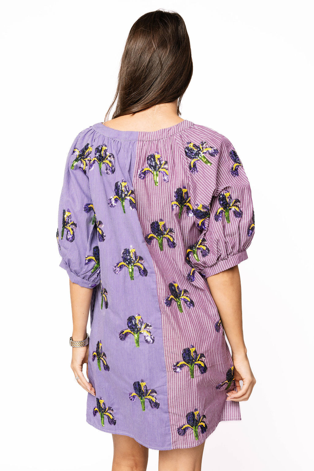 Make a statement in this purple colorblock button-up dress that's bursting with personality! Featuring a stunning sequin iris design adorning both the front and back, this piece transforms a classic silhouette into something truly eye-catching. The vibrant colorblock stripes add movement and dimension, while the shimmering floral details catch the light with every twirl. Perfect for anyone who loves to sparkle and isn't afraid to stand out, this dress combines comfort with show-stopping style that'll have everyone asking where you got it.