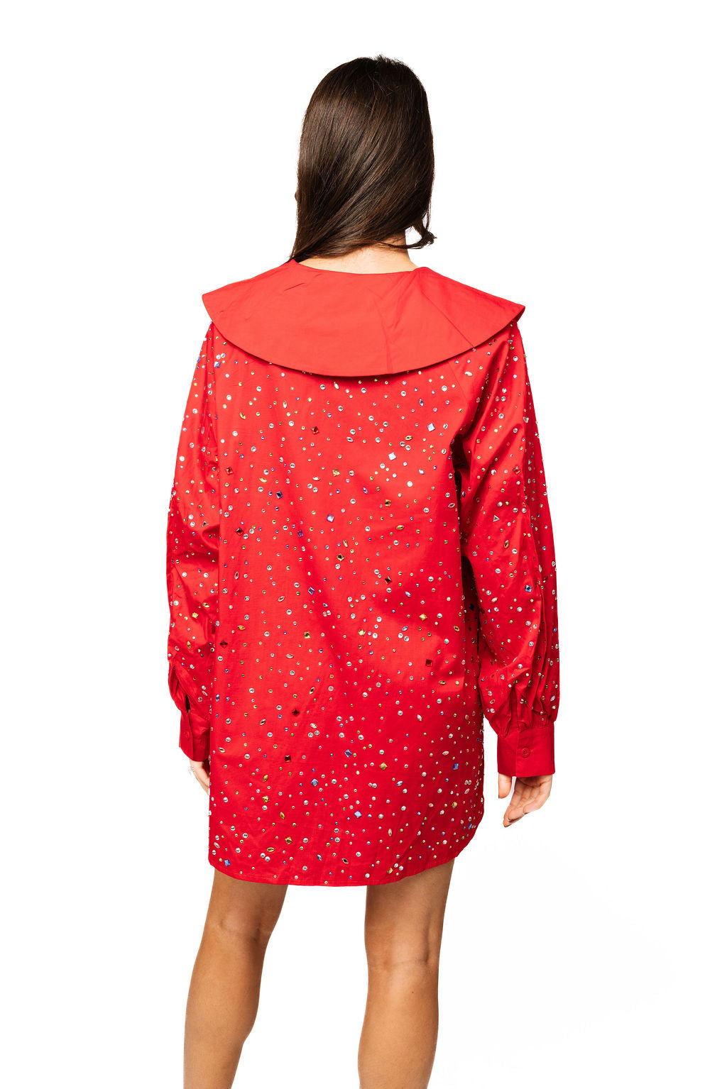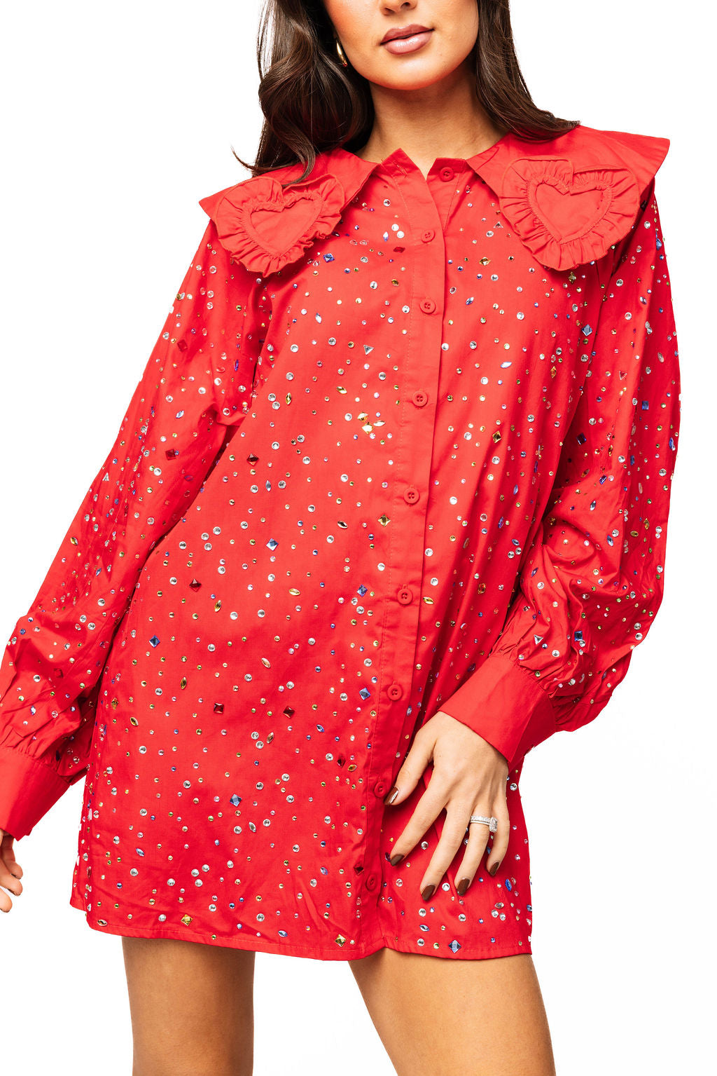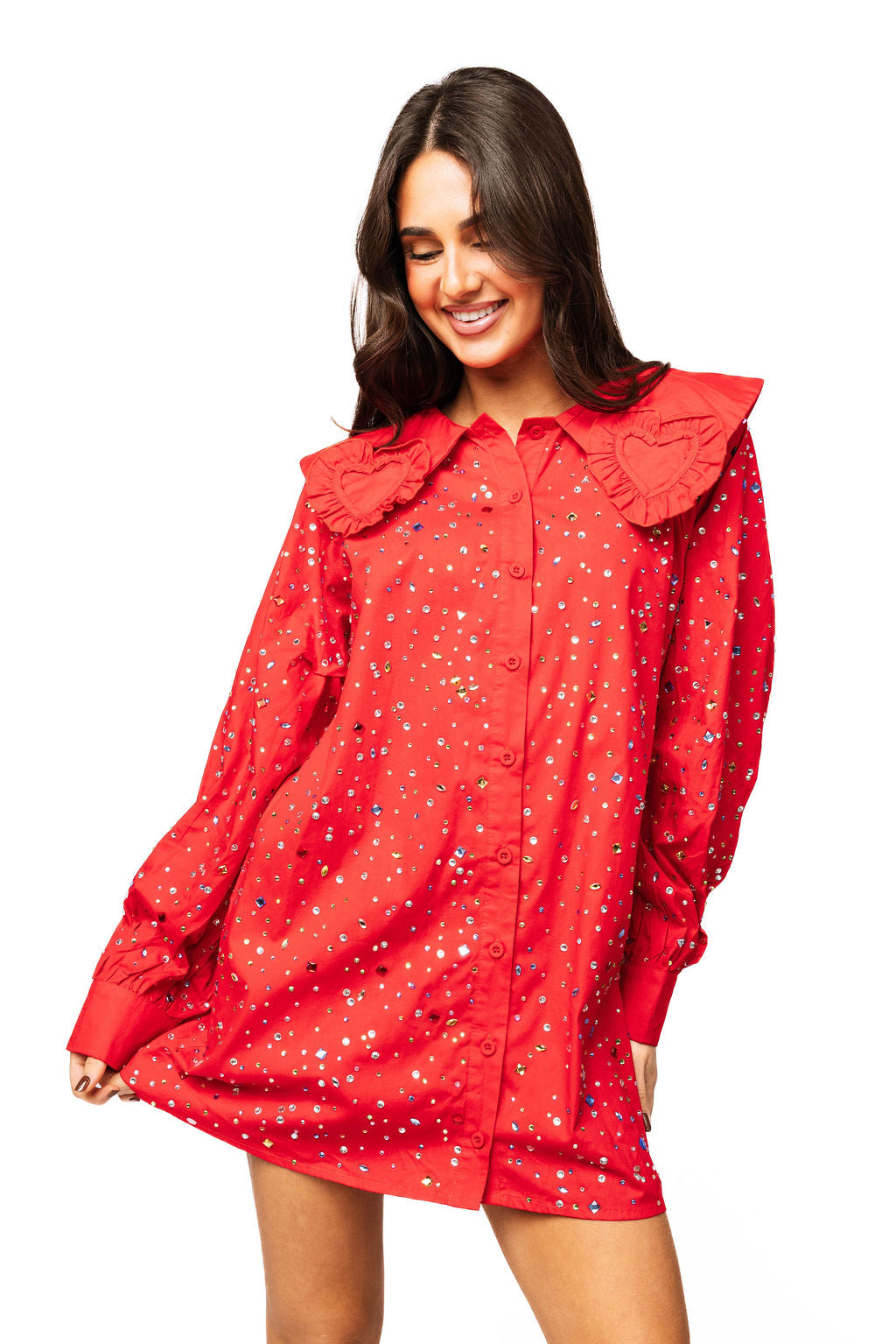 Make a statement in this show-stopping red cotton dress that's basically a love letter to sparkle. The scattered rhinestones catch light from every angle, creating an eye-catching shimmer that demands attention. A charming ruffle heart collar adds a flirty, romantic touch that sets this piece apart from your everyday wardrobe. Crafted from soft, breathable cotton for all-day comfort, this dress is perfect for anyone who believes more sparkle is always the answer. Whether you're heading to a special event or just want to feel fabulous, this rhinestone-studded beauty delivers major personality and shine.