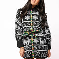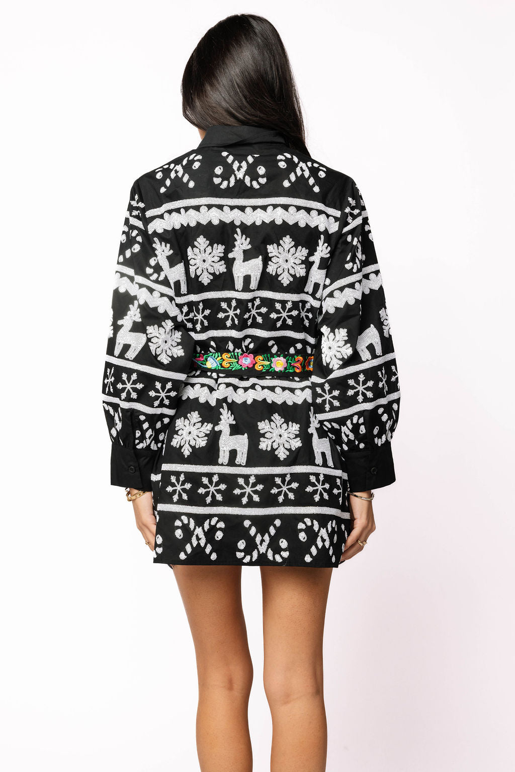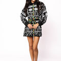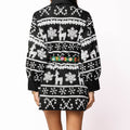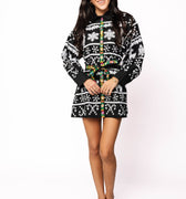 Step into cozy charm with this Black & White Nordic Reindeer & Snowflake Multi Trim Tie Dress. Featuring playful Nordic patterns and a flattering tie waist, it blends festive spirit with comfortable style. Perfect for chilly days and holiday fun, this dress adds a fun twist to your winter wardrobe.