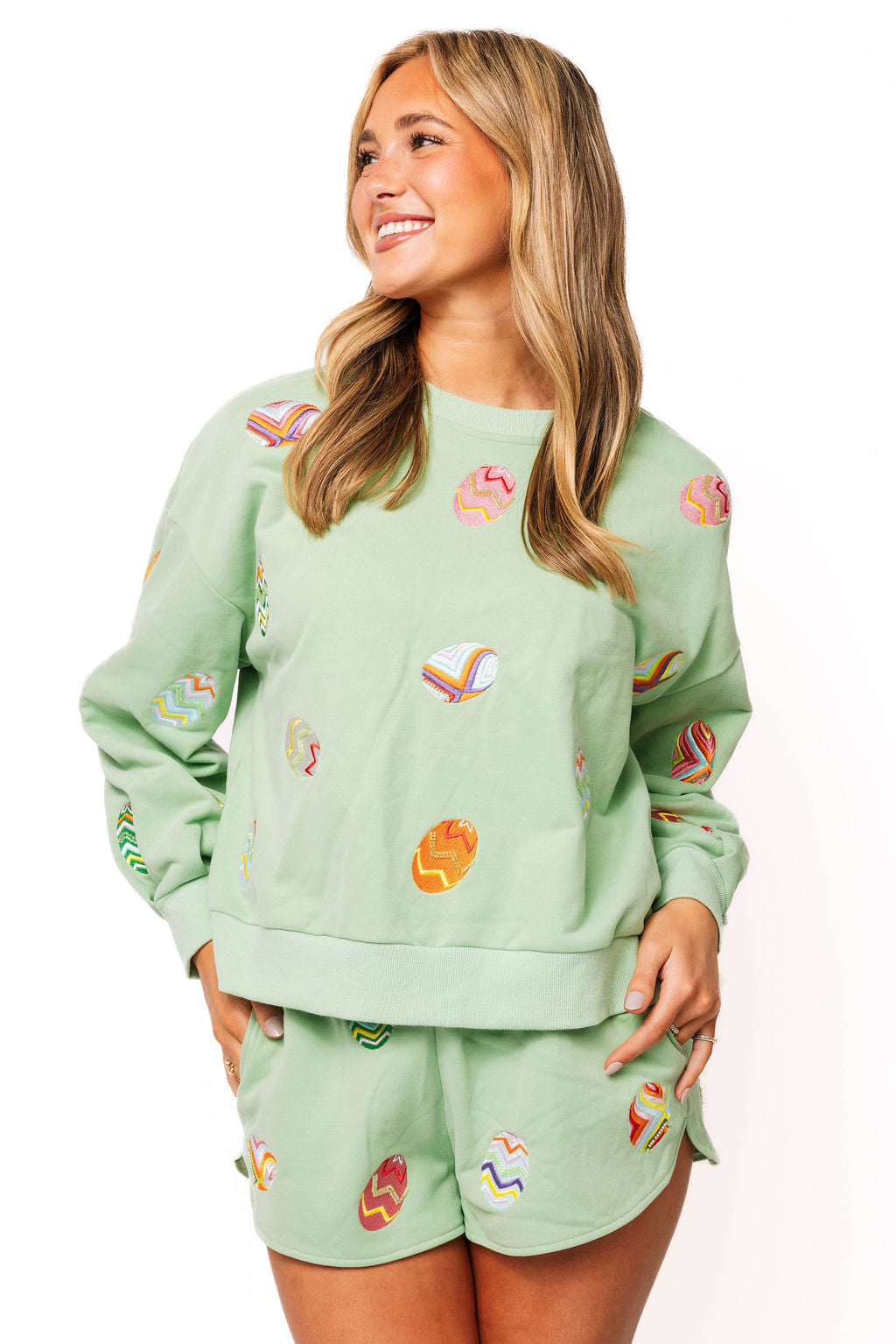 Hop into spring style with these charming mint green shorts featuring a playful multicolor Easter egg design. The comfortable elastic waistband ensures an easy, all-day fit perfect for casual outings, holiday celebrations, or festive gatherings. Soft and versatile, these shorts pair effortlessly with your favorite tees or tank tops for a look that's both fun and put-together. Celebrate the season in style with this delightful wardrobe essential.