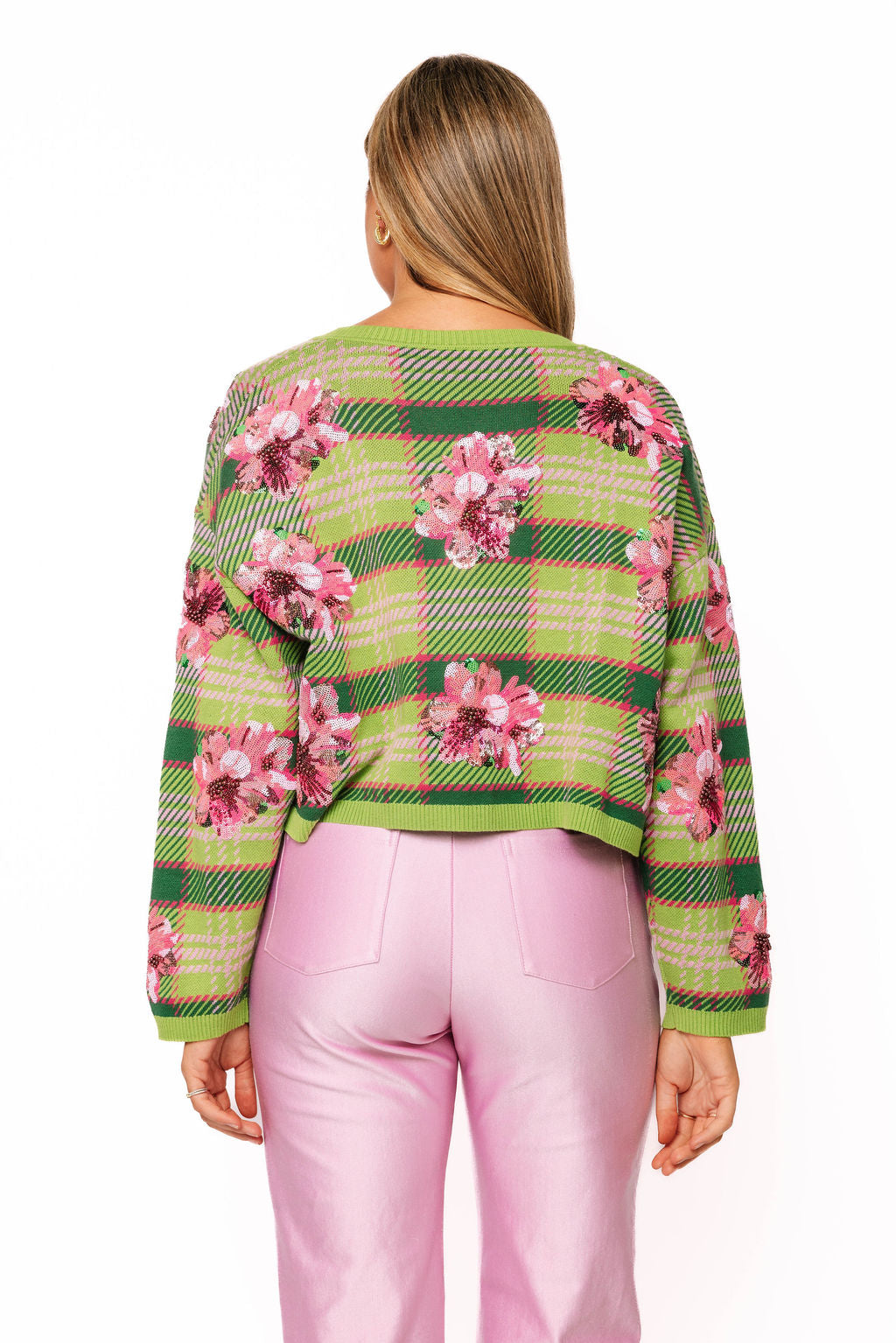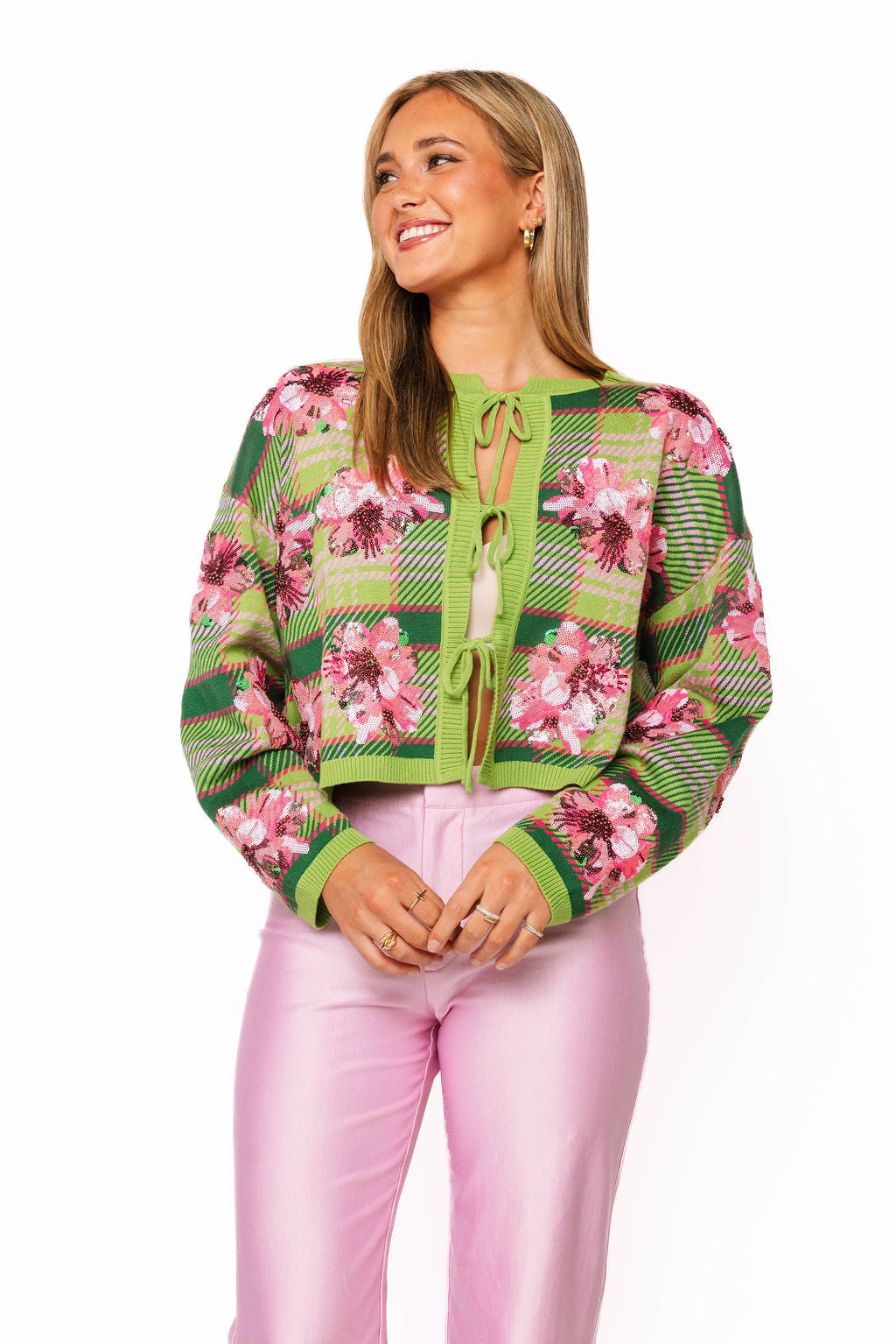 Swing into style with this vibrant green sweater featuring a charming tie-front detail and a show-stopping sequin azalea flower that blooms with pink sparkle. Perfect for the golf course or casual outings, this playful piece combines comfort with eye-catching flair. The adjustable tie front lets you customize your fit while the shimmering floral accent adds that signature Queen of Sparkles glamour to your wardrobe. Tee off in confidence and color!
