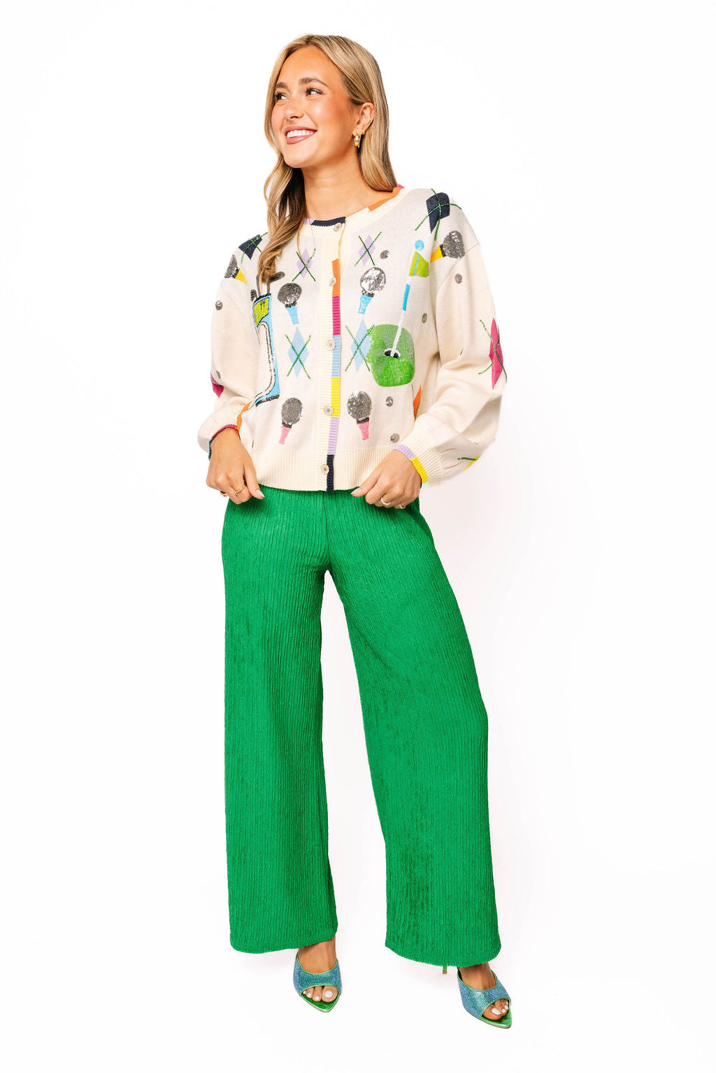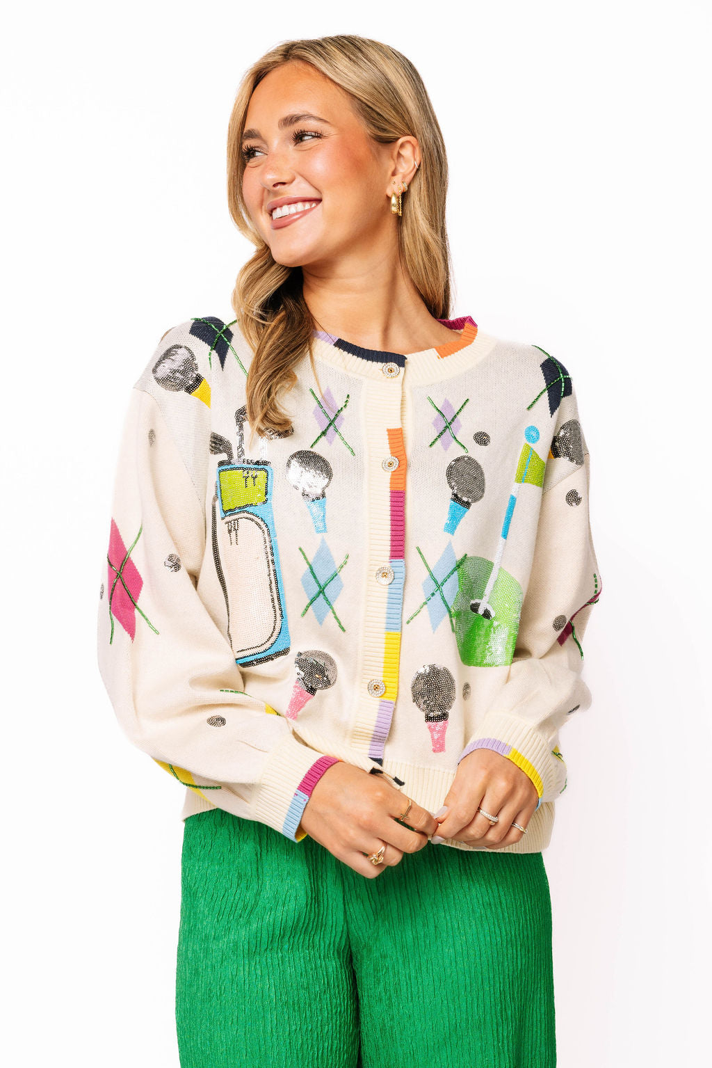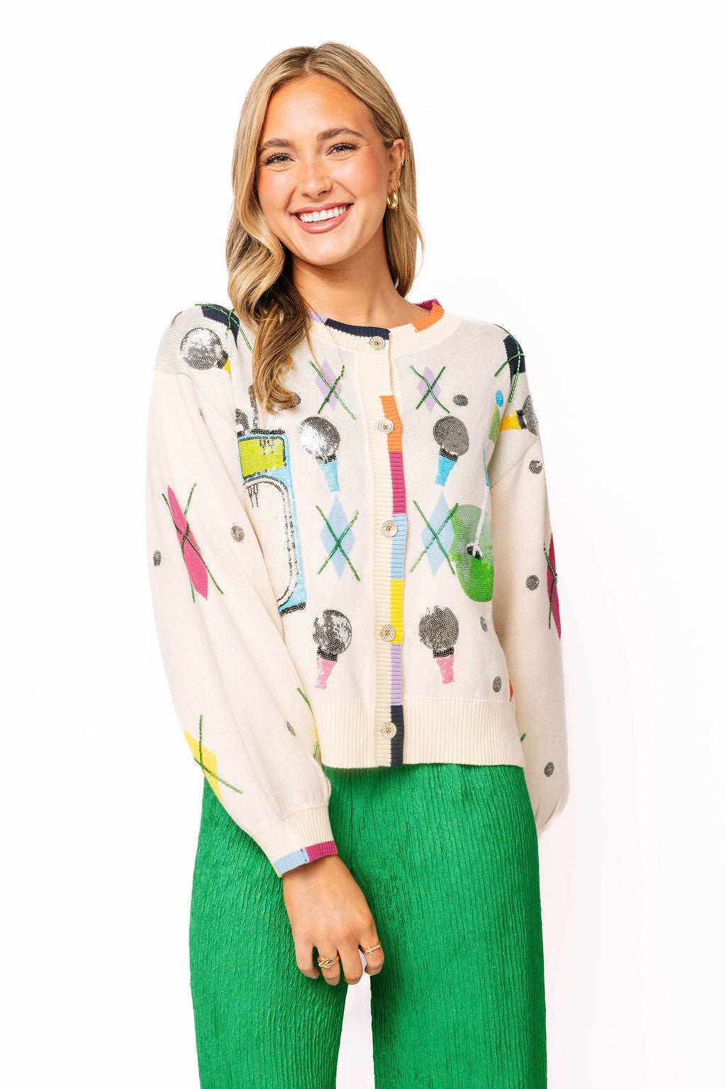 Elevate your golf game with this eye-catching cardigan that combines classic argyle styling with playful golf-inspired details. Featuring scattered golf icons—balls, tees, and clubs—throughout the design, this piece brings personality to the course or casual outings. The vibrant rainbow trim adds a modern pop of color that stands out from traditional golf wear. Perfect for layering over your favorite golf outfit or wearing solo for a statement look, this button-up cardigan merges timeless preppy style with contemporary flair. Whether you're a golf enthusiast or simply love bold, fun fashion, this cardigan delivers both comfort and conversation-starting style.
