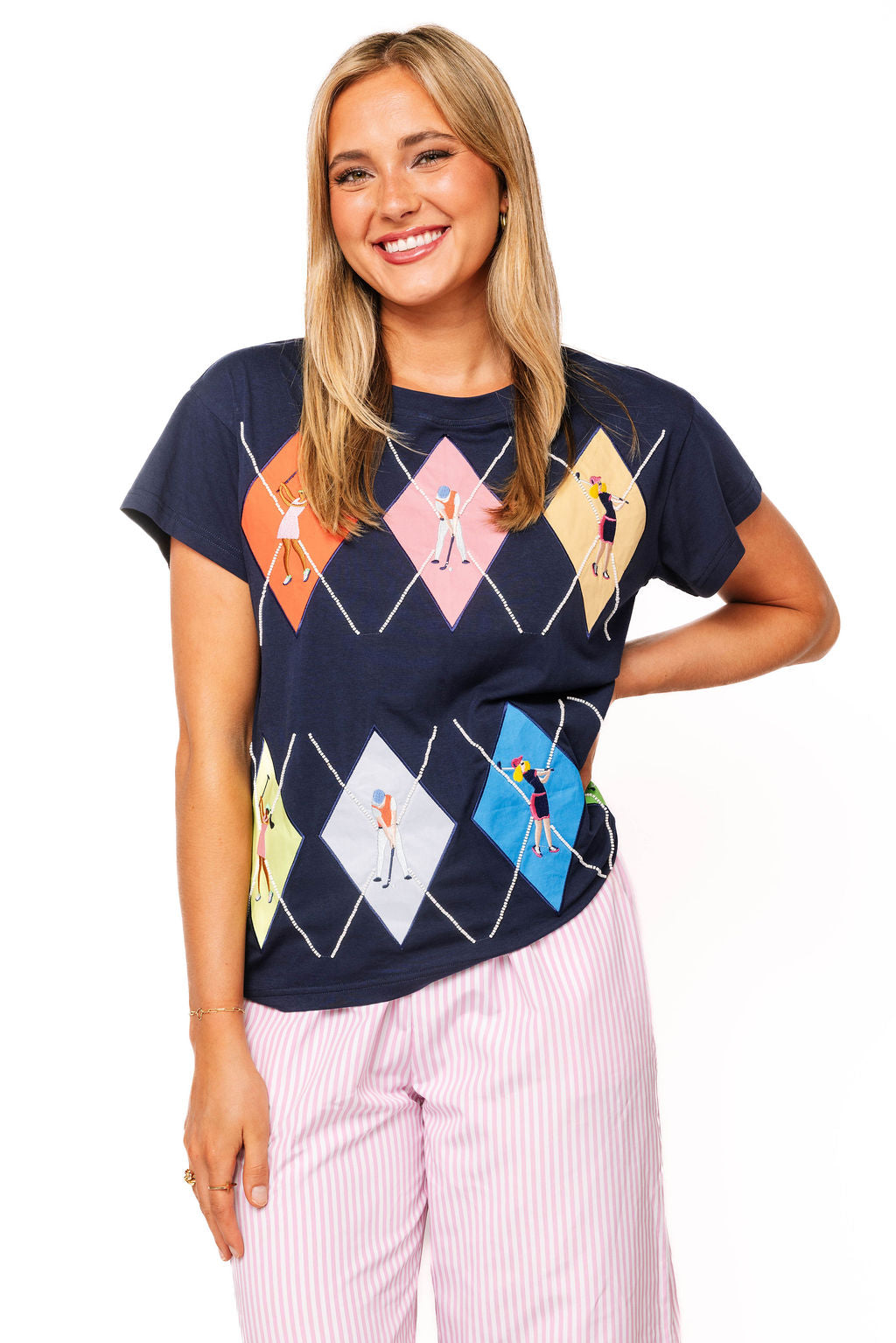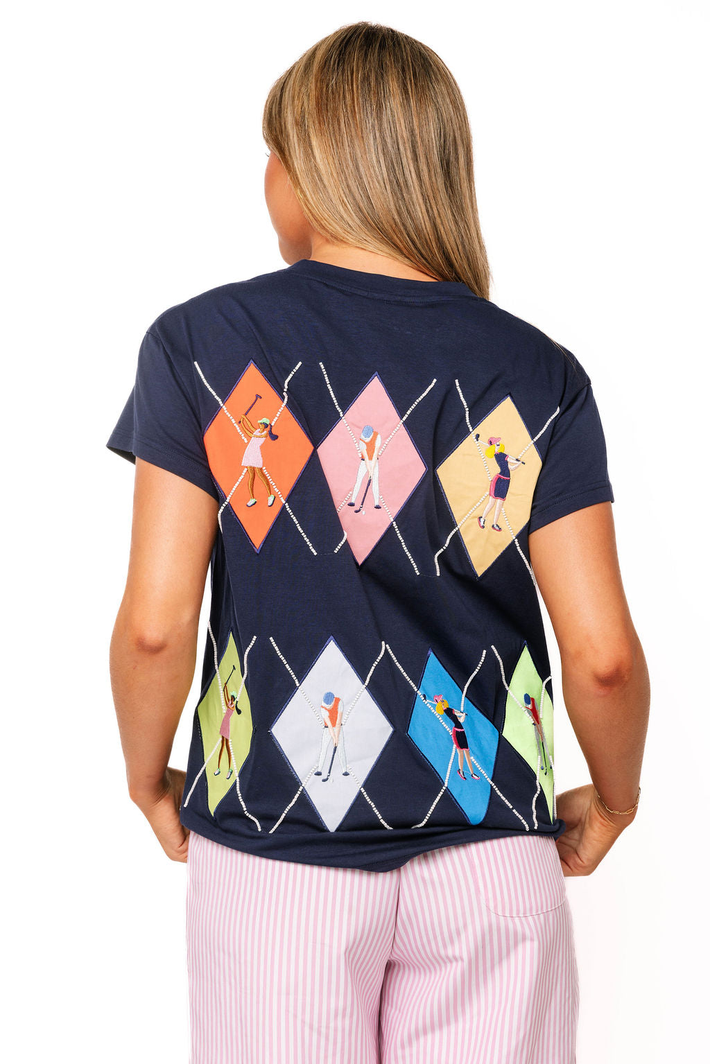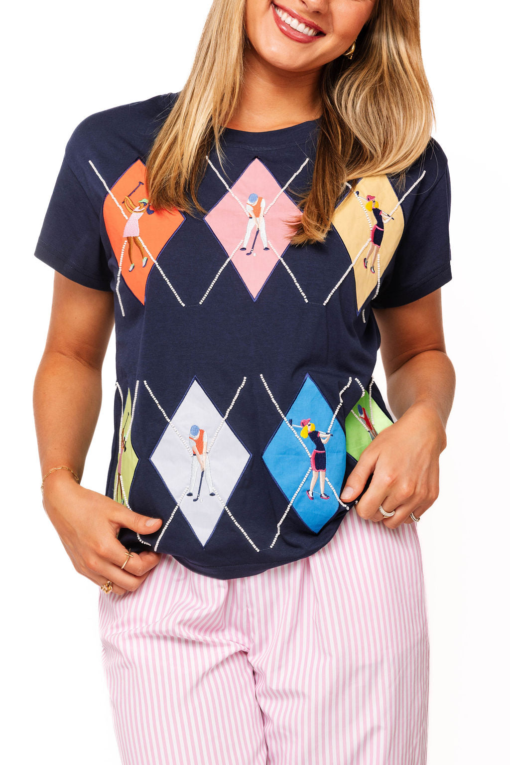 Elevate your casual wardrobe with this navy tee featuring a striking multi-colored argyle pattern and charming golfer detail. Perfect for golf enthusiasts and style-conscious shoppers alike, this versatile piece transitions seamlessly from the course to everyday wear. The classic argyle design adds preppy sophistication, while the thoughtful golfer motif celebrates your passion for the game. Crafted for comfort and durability, this tee is an essential addition to any collection that values both personality and quality.