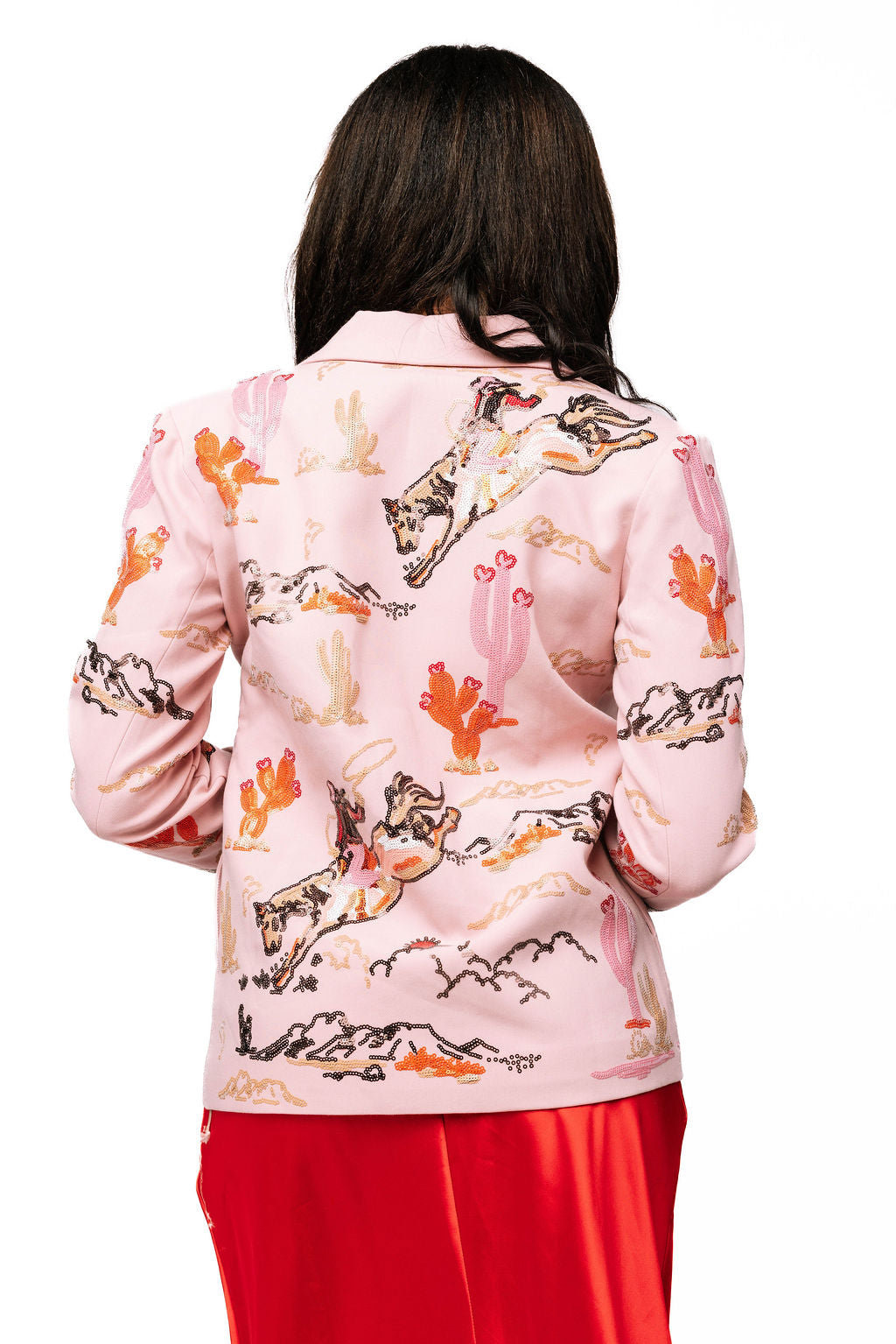 Saddle up in style with this light pink blazer featuring a bold bucking cowgirl design that's ready to turn heads at the rodeo. Perfect for anyone who wants to bring Western flair to their wardrobe with a fun, feminine twist. Whether you're hitting the arena or making a statement at a country event, this blazer combines classic rodeo spirit with modern edge. Giddy up and let your inner cowgirl shine!