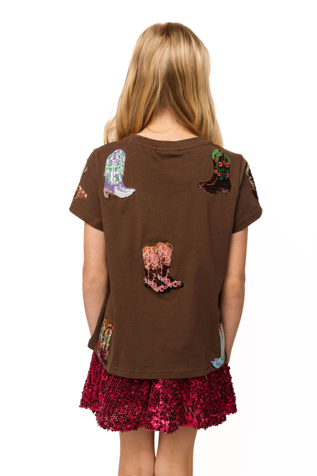 Little ones will love showing off their wild west style in this fun brown tee! Featuring eye-catching cowboy boot designs on both the front and back, it's perfect for kids who dream of the open range. Soft, comfortable, and ready for adventure—whether they're playing pretend or heading out for a day of fun. Let them saddle up in style!