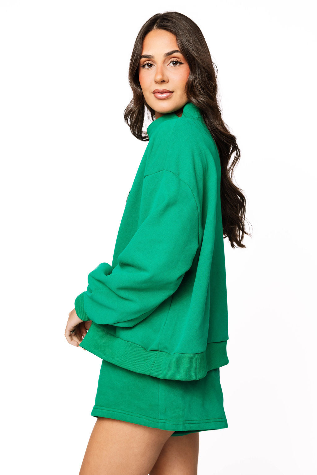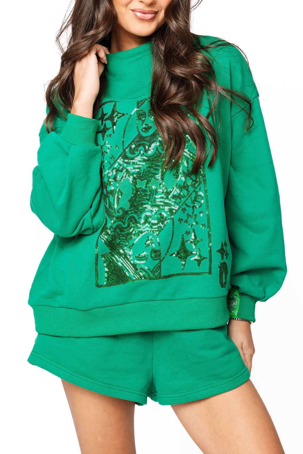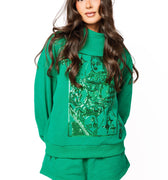 Rock the ultimate sparkle moment with this Emerald QOS Sparkle Logo Short! Featuring a comfy elastic waistband and dazzling sequin design, it's the perfect piece for showing off your glam side. Pair it with our matching mock-neck sweatshirt to complete your head-to-toe Queen of Sparkles look and shine like the royalty you are!