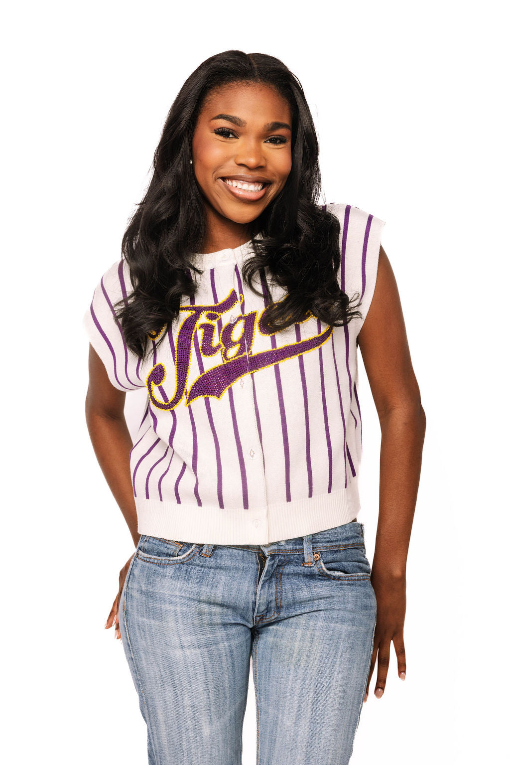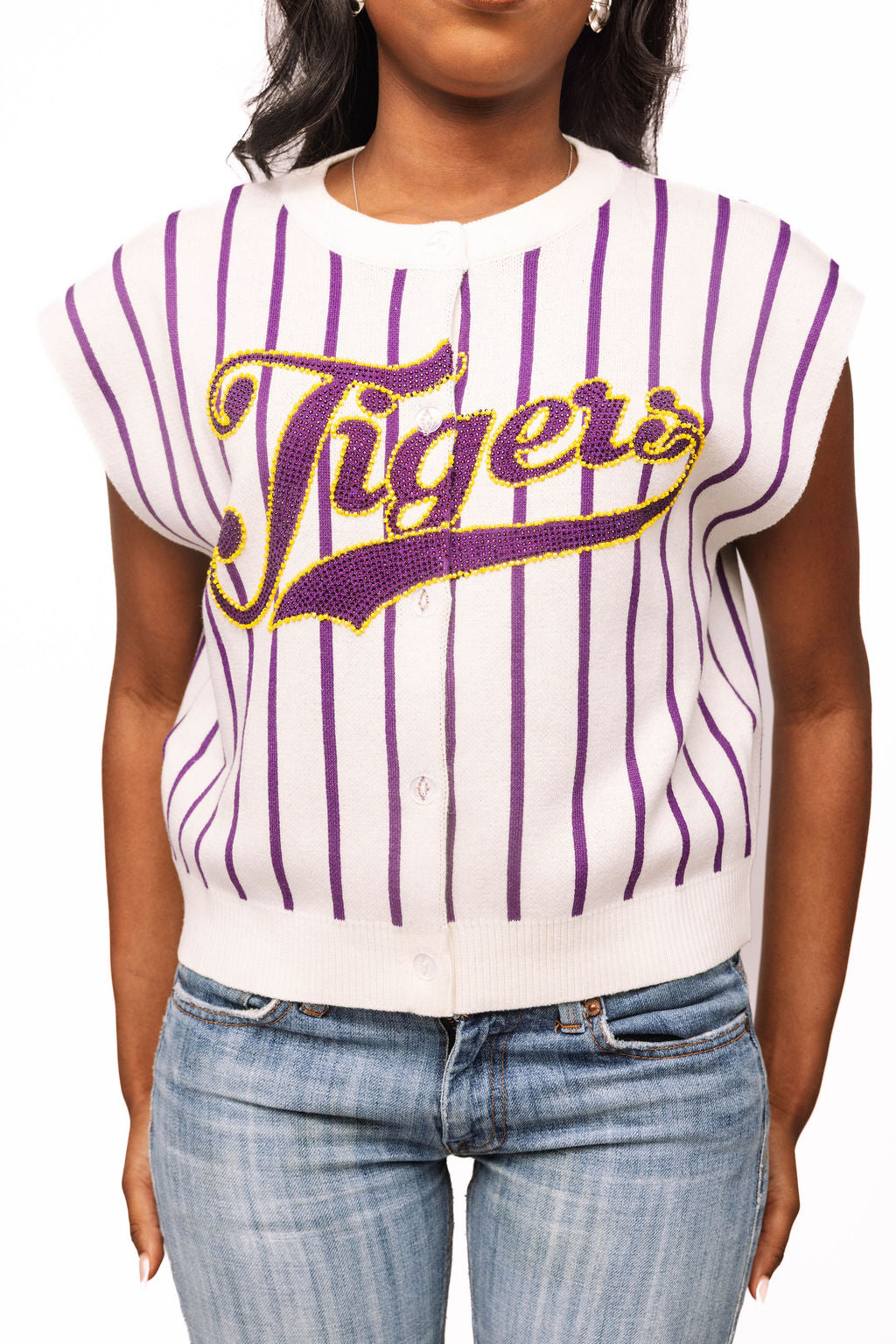 Show your Tiger pride in style with this officially licensed LSU striped knit vest. Featuring bold white and purple stripes with "Tigers" emblazoned across the chest, it's the ultimate game day essential. The classic button-up design pairs effortlessly with your favorite tee or layered over long sleeves for versatile seasonal wear. Whether you're cheering from the stands or celebrating a victory, this comfortable knit vest lets you rep your school colors with unmistakable spirit and flair.