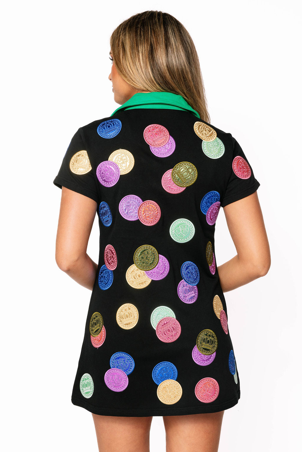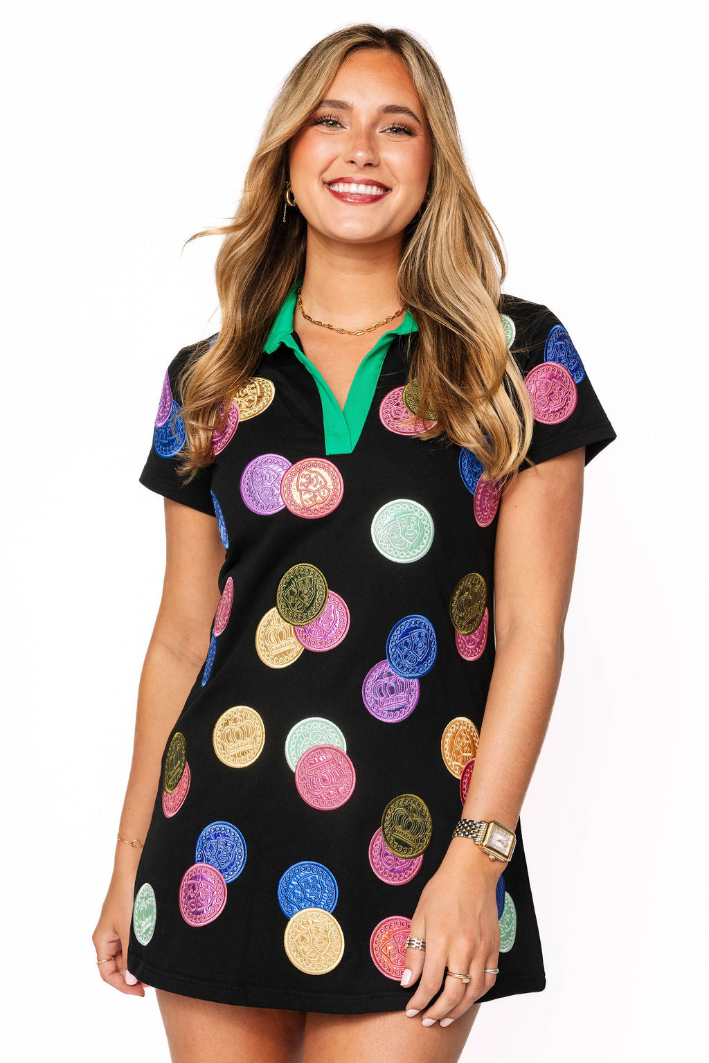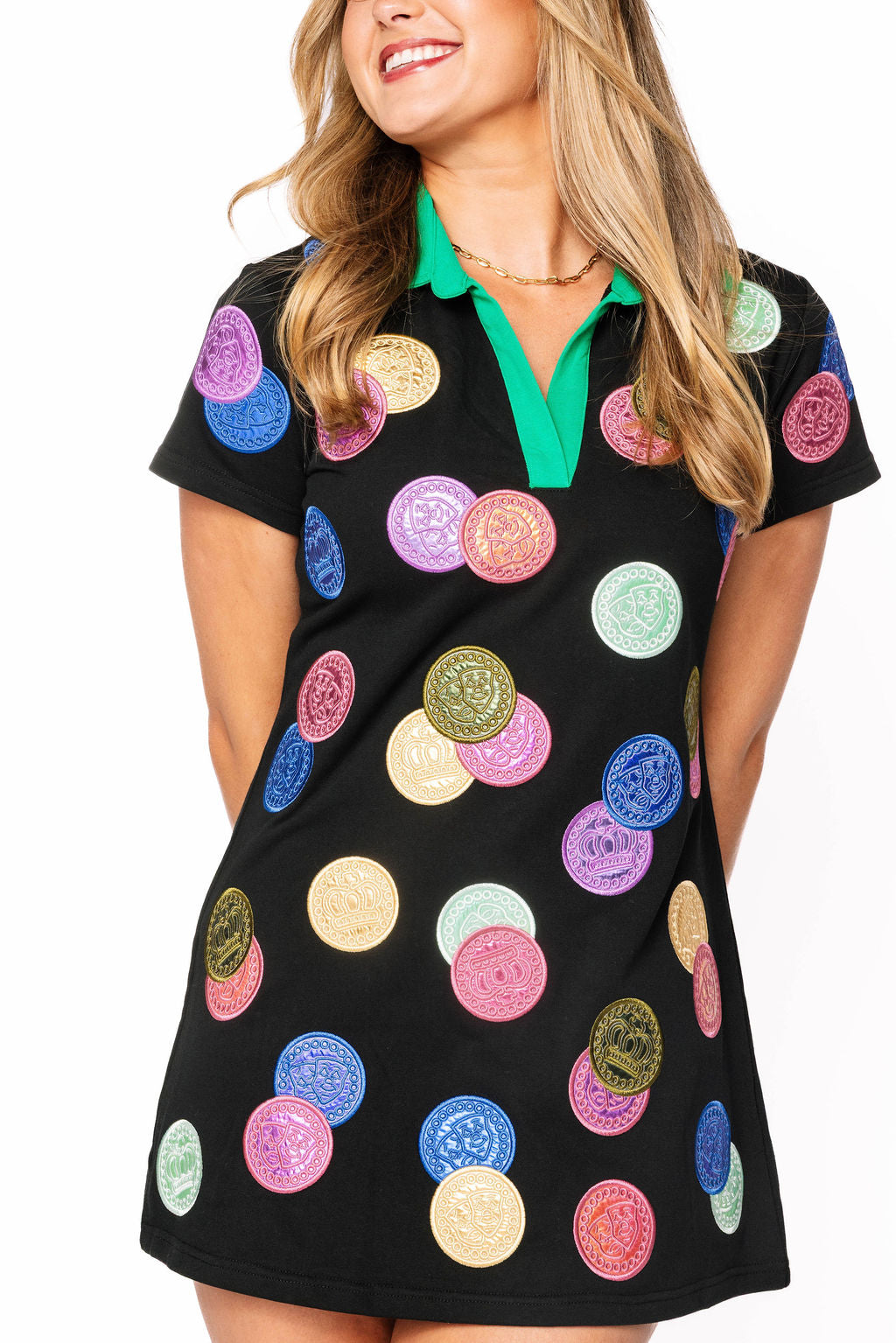 Get ready to celebrate in style with this festive black dress designed for Mardi Gras magic. The striking green collar frames your face beautifully while the multi-color doubloon design captures all the glitz and glamour of the season. Short sleeves keep you comfortable as you dance through the festivities, and the bold color-blocking ensures you'll shine brighter than the beads flying your way. Whether you're hitting the parade route or heading to a masquerade ball, this dress delivers the perfect blend of fun and flair. Let the good times roll in this showstopping piece!