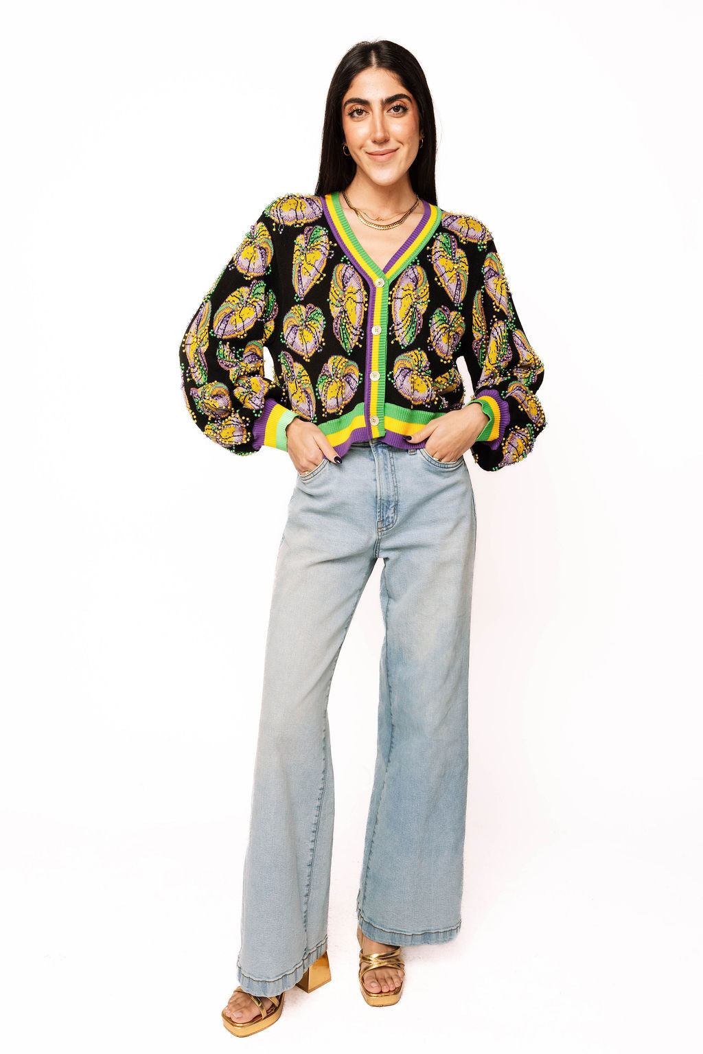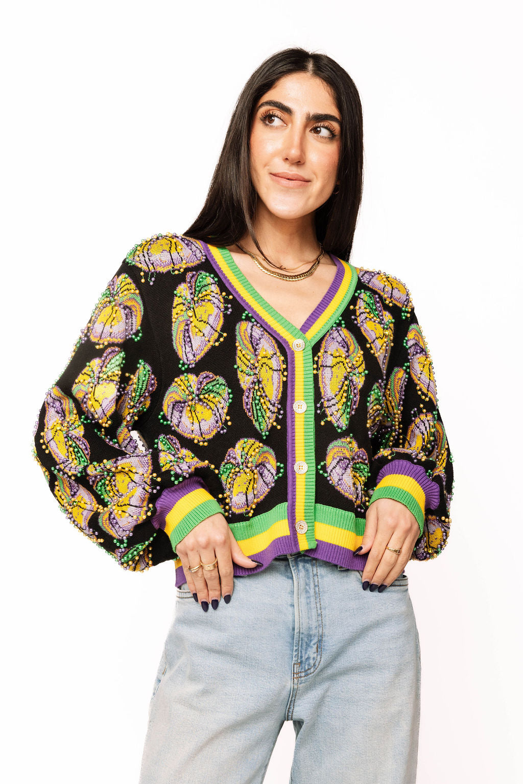 Wrap yourself in festive flair with this Black Pearl King Cake Cardigan! This playful piece features a striking black base adorned with a vibrant purple, yellow, and green striped trim that brings Mardi Gras magic to your everyday wardrobe. The showstopper? Real beads embellishing an intricate king cake design that catches the light beautifully. Perfect for celebrating in style or adding a touch of sparkle to any occasion, this cardigan transforms a classic silhouette into a conversation-starting statement piece.