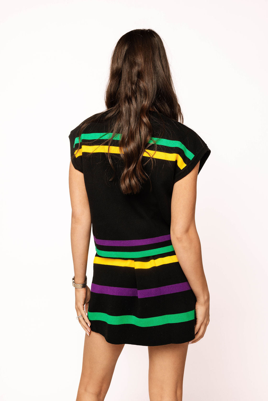 Get ready to turn heads in this black sweater skirt featuring bold yellow, purple, and green stripes that scream festive fun. Perfect for celebrating in style, this piece brings that Mardi Gras energy to any occasion. Layer it with our matching striped top or sweater to complete the coordinated look and maximize your sparkle factor. Whether you're hitting a party or making a statement, this striped sensation delivers playful personality with every wear.