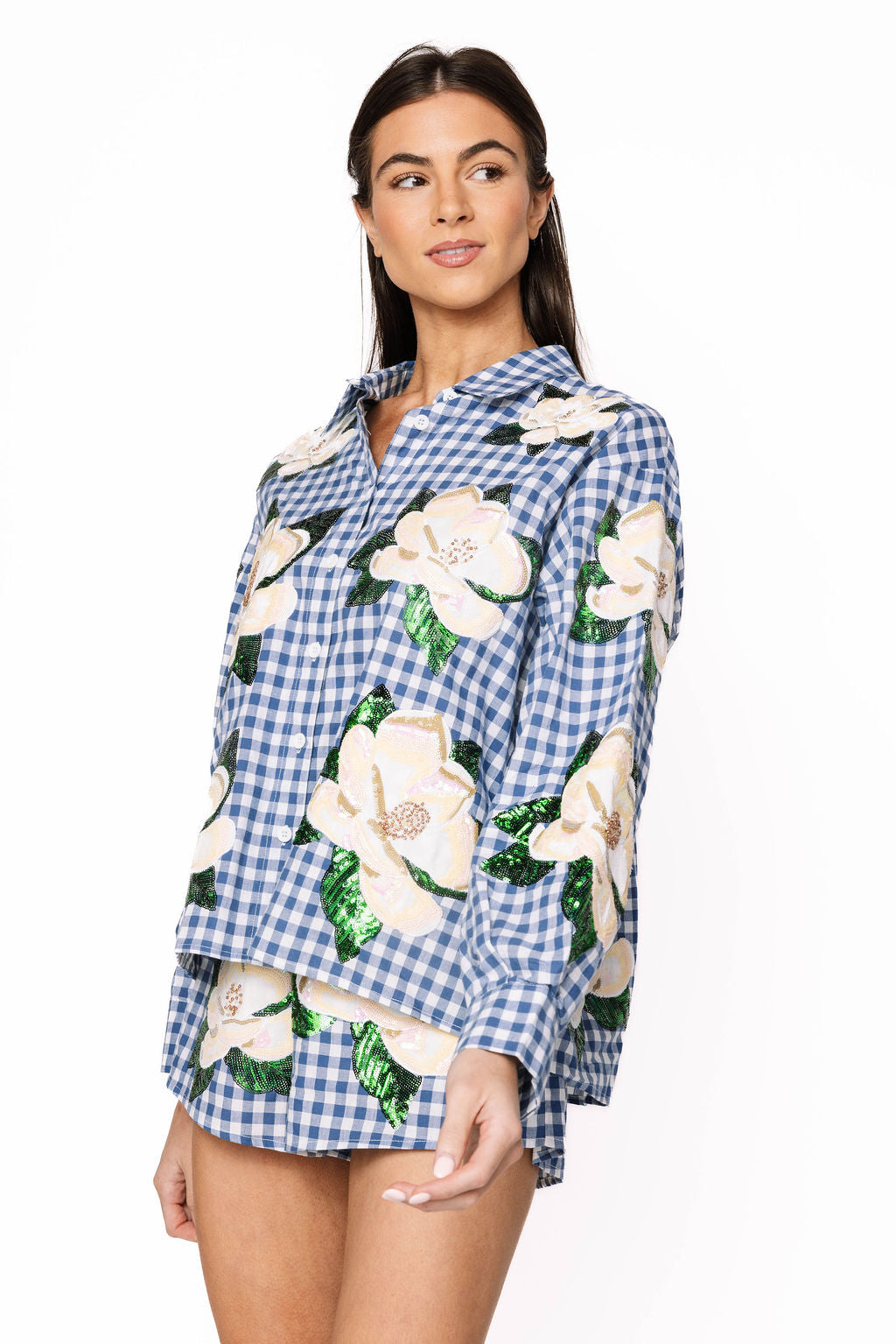 Elevate your wardrobe with these charming blue and white gingham shorts, adorned with shimmering sequin magnolia blooms scattered across the front and back. The crisp gingham pattern pairs perfectly with our matching top for an effortlessly coordinated look that's equal parts sweet and sparkly. Whether you're heading to brunch or a garden party, this playful piece brings Southern charm with a glamorous twist.!