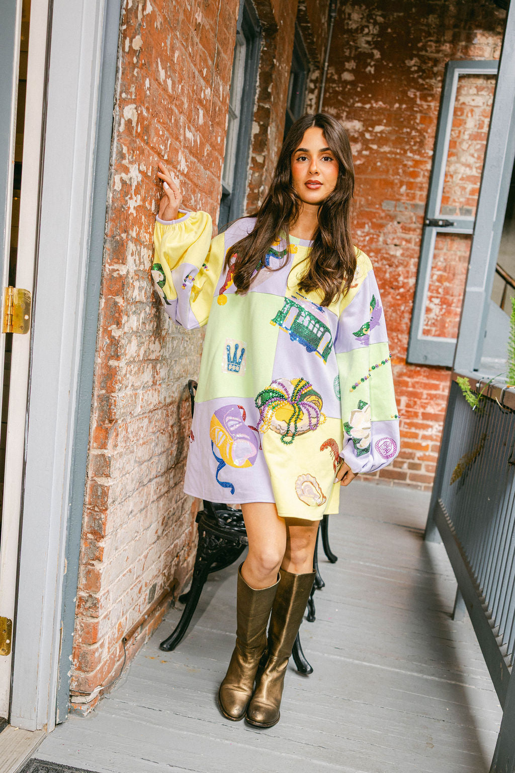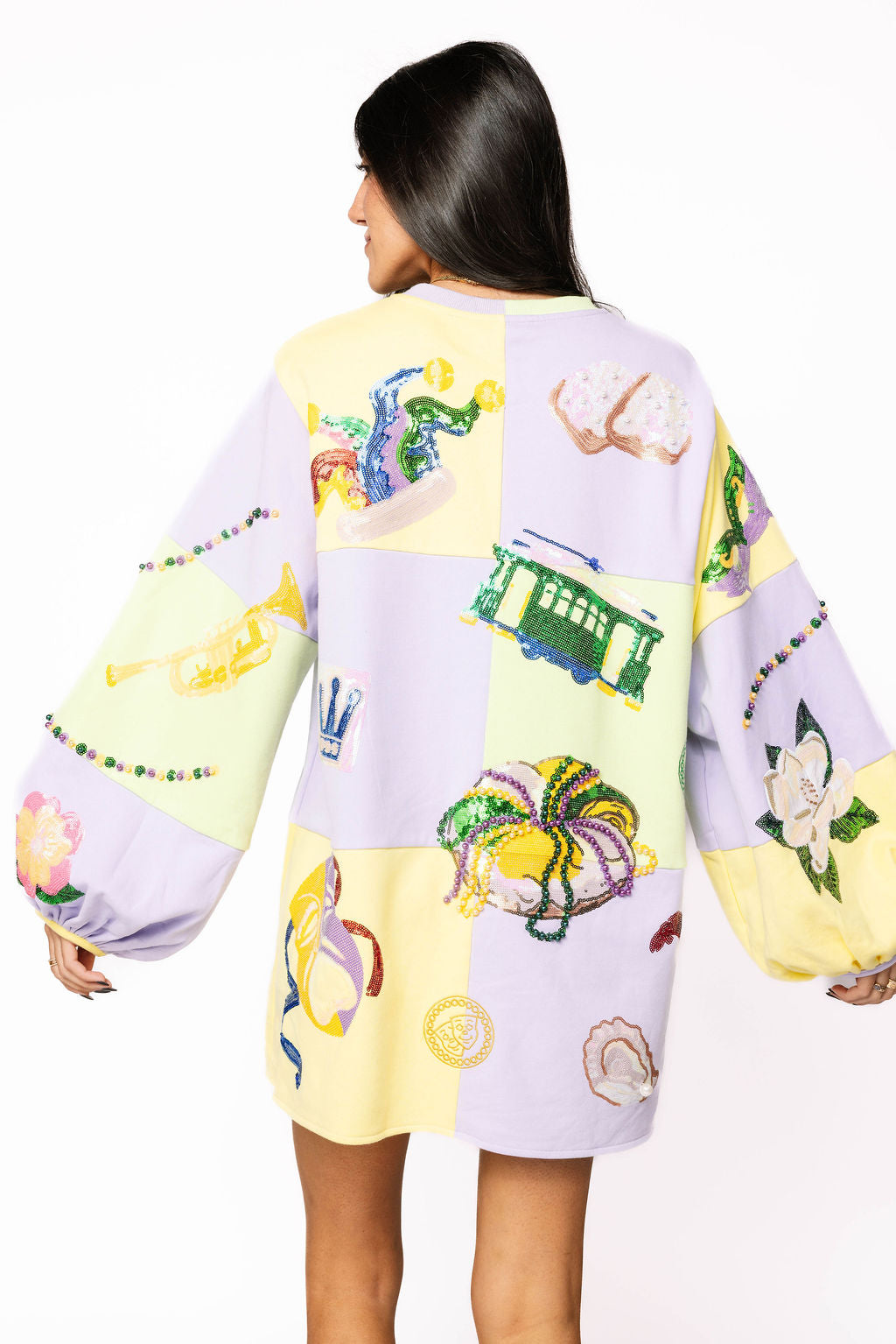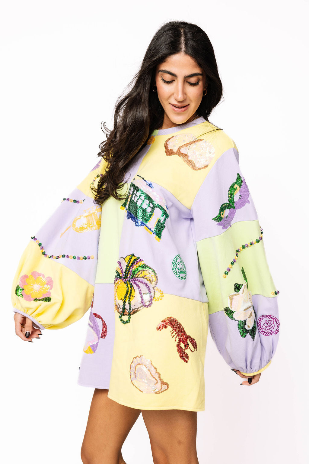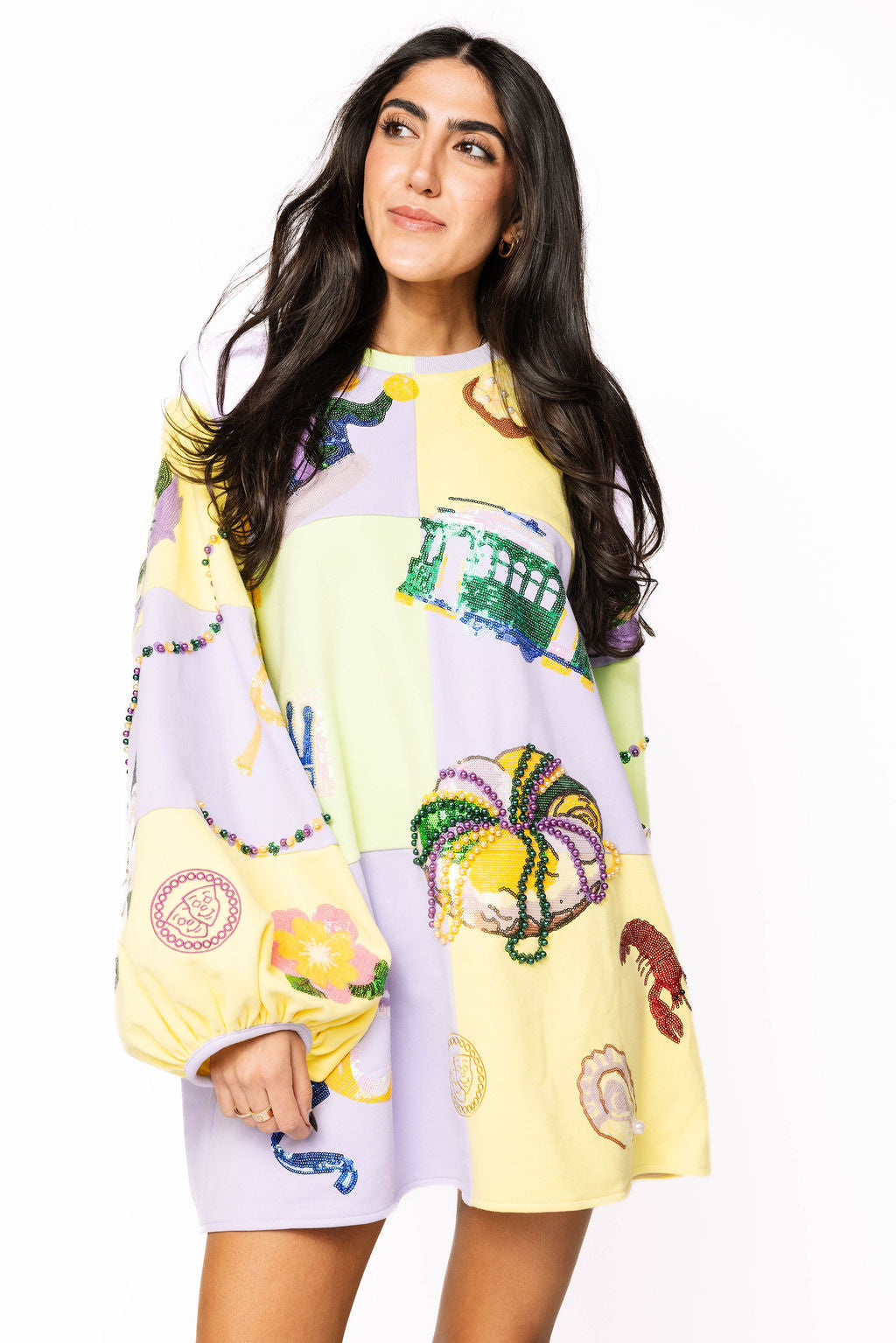 Step into the spotlight with this show-stopping checkered dress that brings Mardi Gras magic to every occasion. Featuring a vibrant yellow, lavender, and green color-blocked pattern, this dress celebrates festive flair with eye-catching sequin Mardi Gras icons scattered throughout. The dramatic long balloon sleeves add movement and dimension, creating an unforgettable silhouette that commands attention. Perfect for parades, parties, or anyone ready to sparkle with personality and pizzazz.