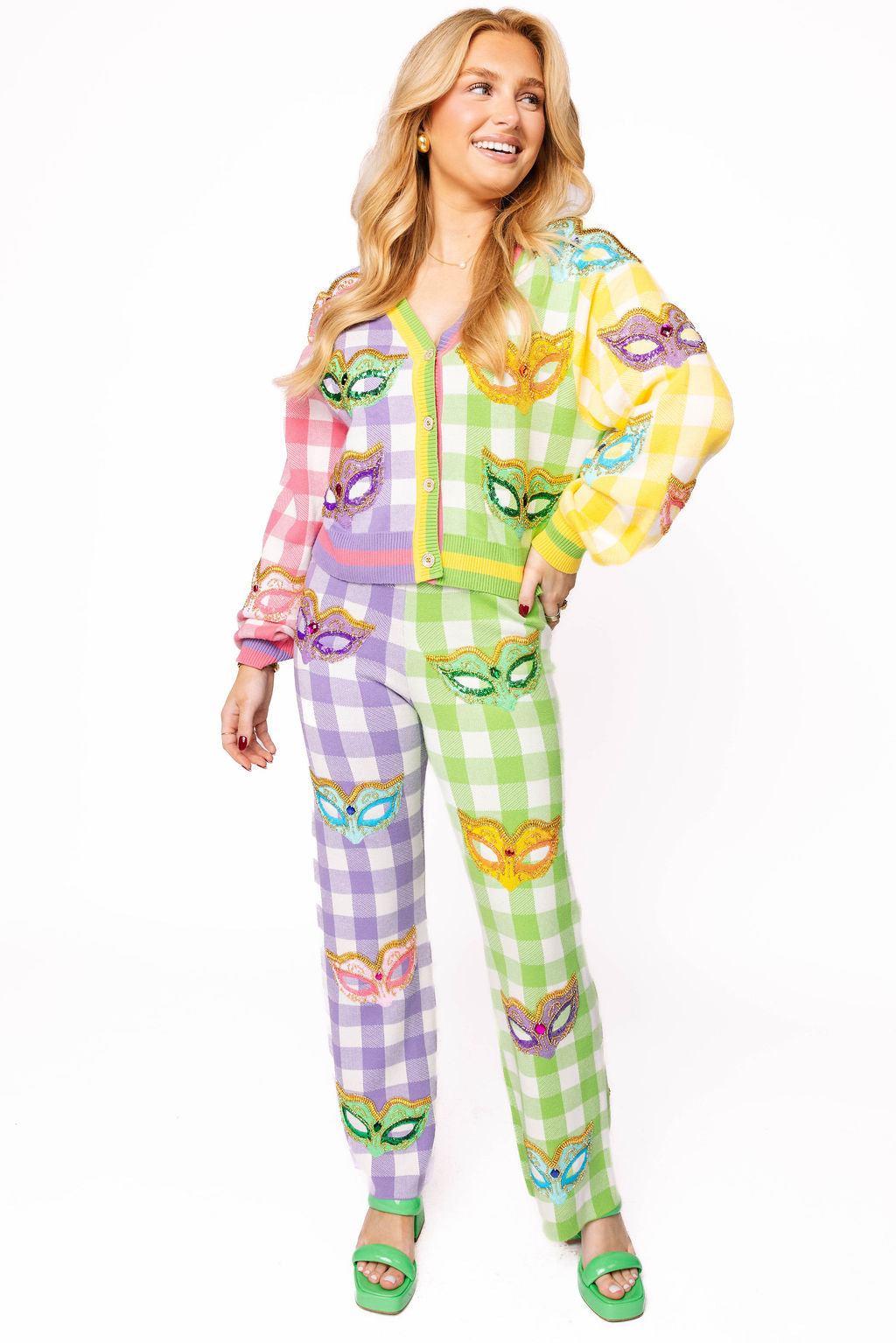 Bring the party vibes with these show-stopping colorblock plaid pants featuring a dazzling sequin mask design that screams Mardi Gras magic. The pastel gingham pattern pops with festive energy, perfect for celebrating in style. Pro tip: Pair with our matching cardigan to complete the full coordinated ensemble and turn heads wherever you go!