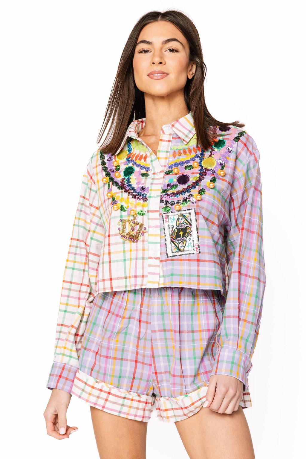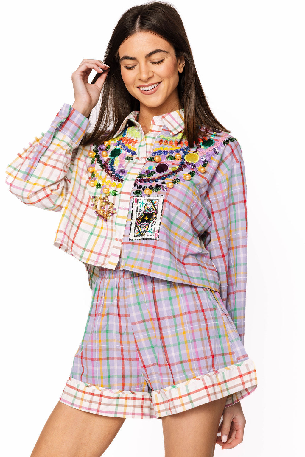 Rock the ultimate festive vibe with these vibrant colorblock plaid shorts! Bursting with bold Mardi Gras hues, they're the perfect canvas for creating your signature celebration look. Mix and match with our coordinating plaid top to nail the full ensemble, or style them solo for maximum impact. Crafted from soft, breathable cotton, they're as comfortable as they are eye-catching. Whether you're hitting the parade or turning heads at the party, these shorts deliver serious fun factor with every wear.