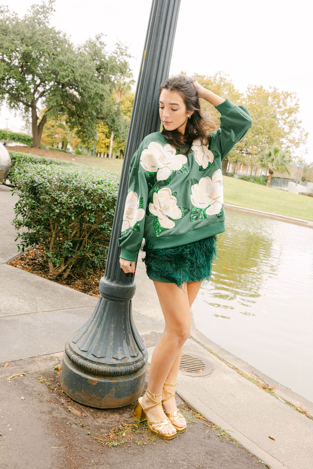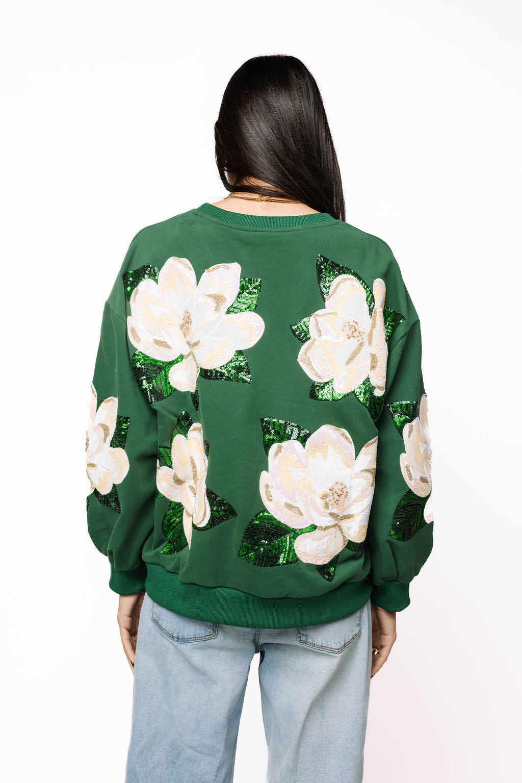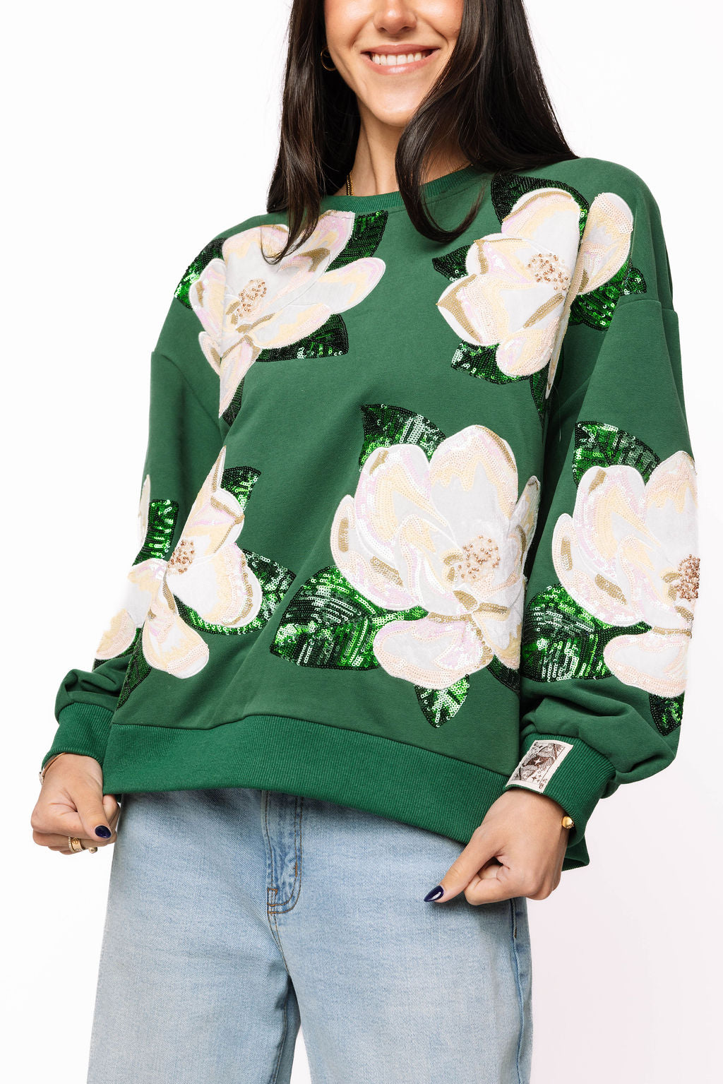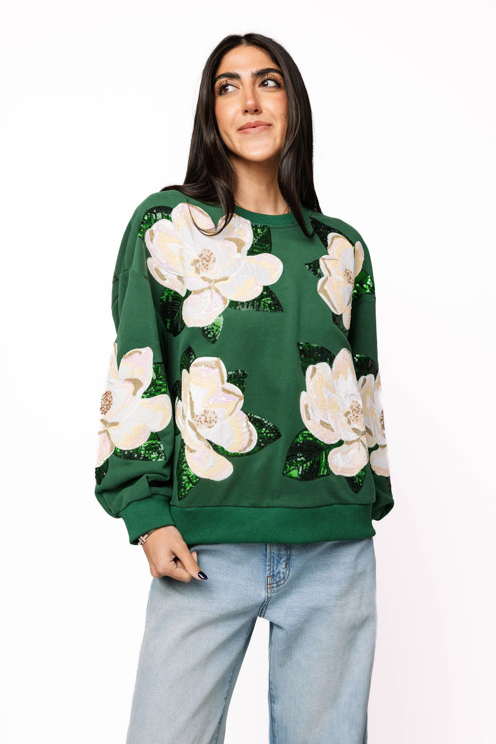 Wrap yourself in cozy elegance with this dark green sweatshirt featuring a stunning sequin magnolia design that graces both the front and back. The slightly oversized fit offers that perfect laid-back vibe while the shimmering florals add just the right amount of sparkle to your everyday look. Whether you're lounging at home or stepping out in style, this piece brings botanical beauty and comfort together in one fabulous package.