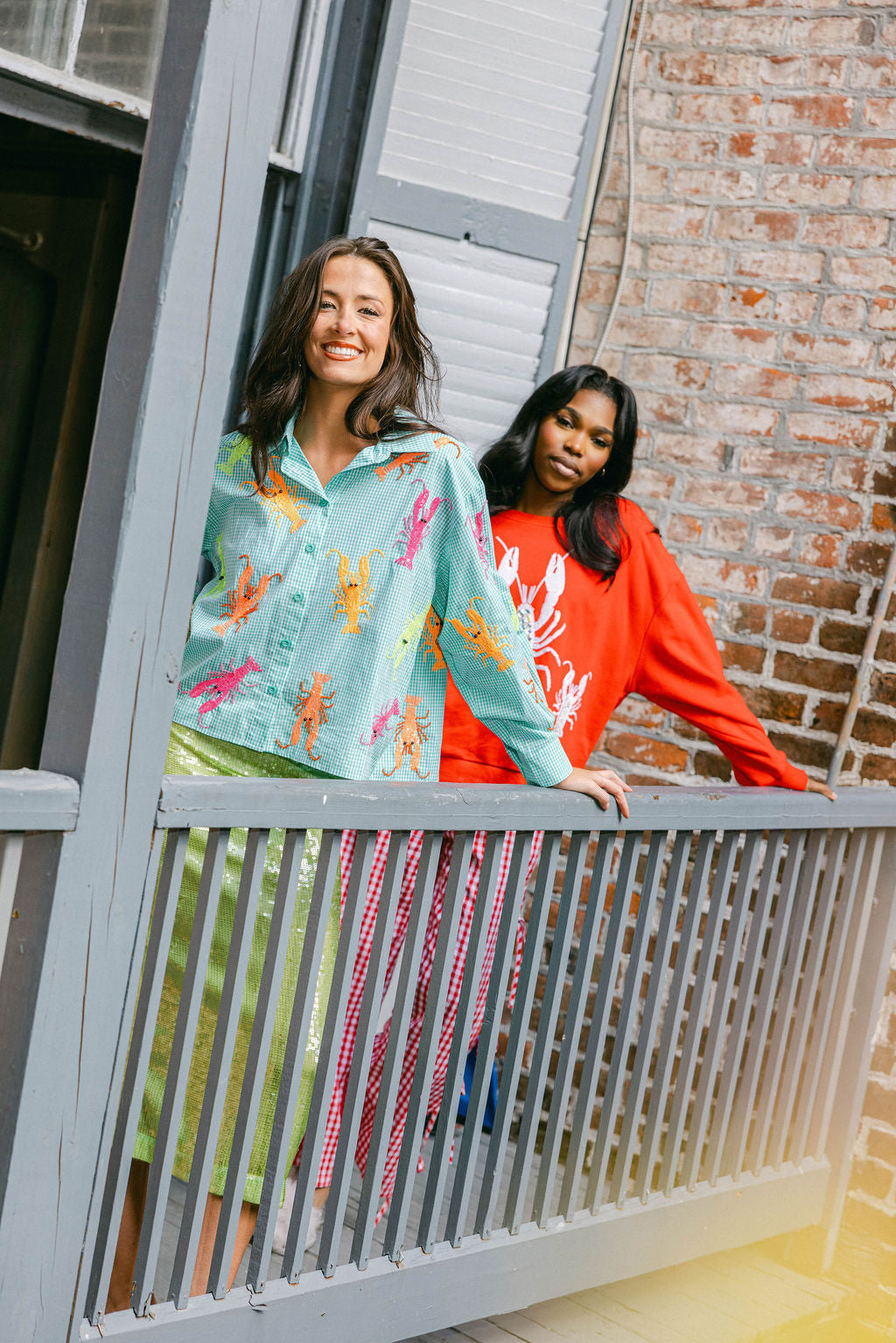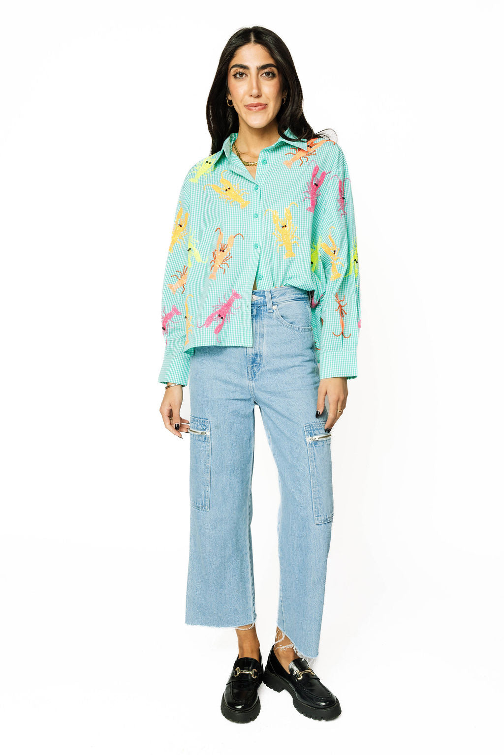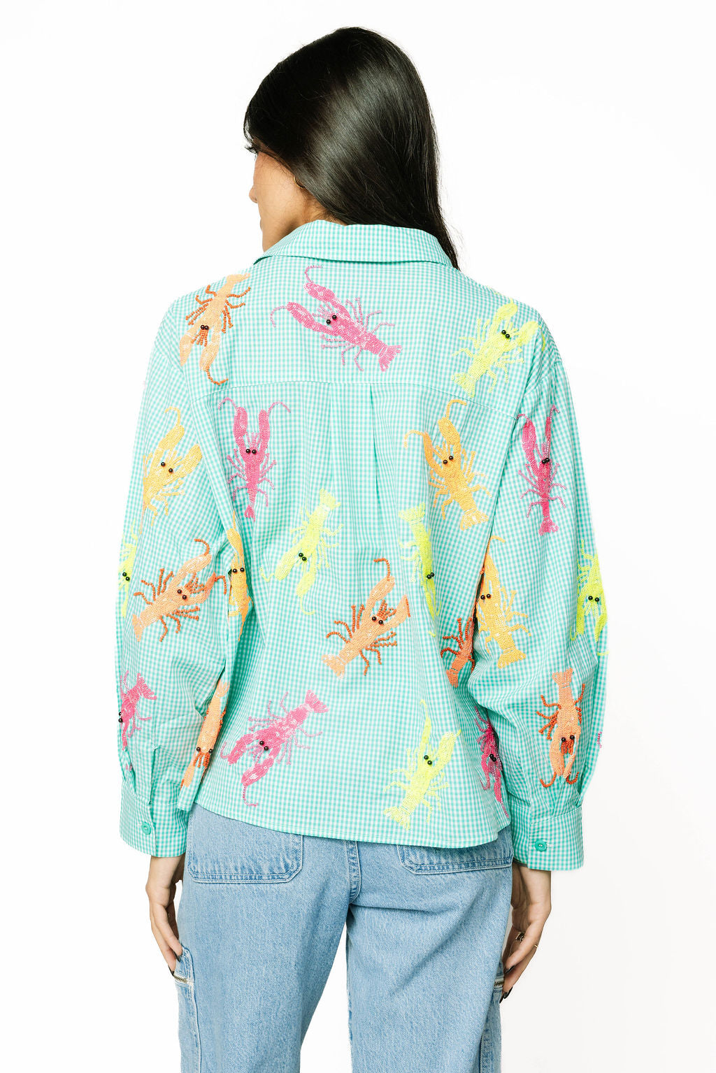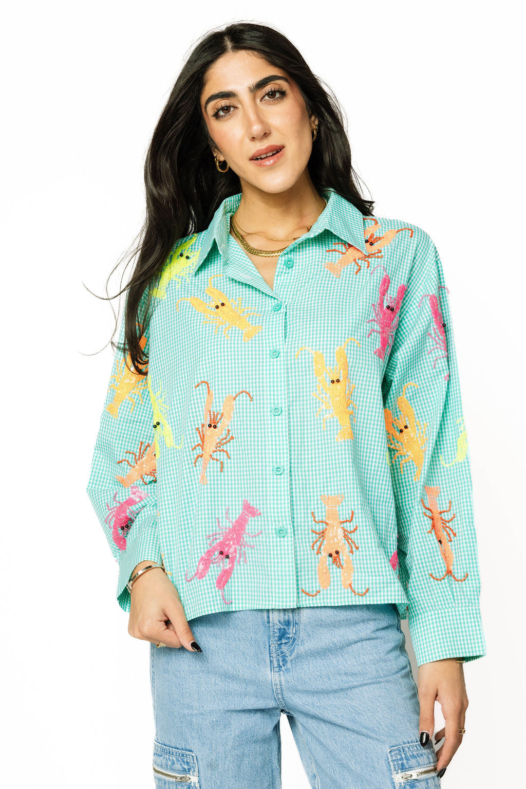 Make a splash with this gingham button-up top featuring a show-stopping neon sequin crawfish design! Perfect for adding personality to your wardrobe, this playful piece combines classic gingham charm with bold, eye-catching sparkle. The vibrant crawfish motif brings coastal fun and festive flair to any outfit. Whether you're heading to a casual gathering or want to turn heads, this top delivers style with a wink and a shimmer. Dress it up or down for endless styling possibilities!
