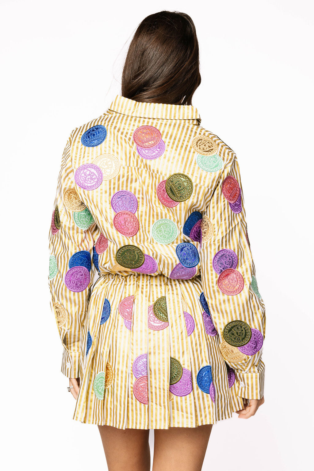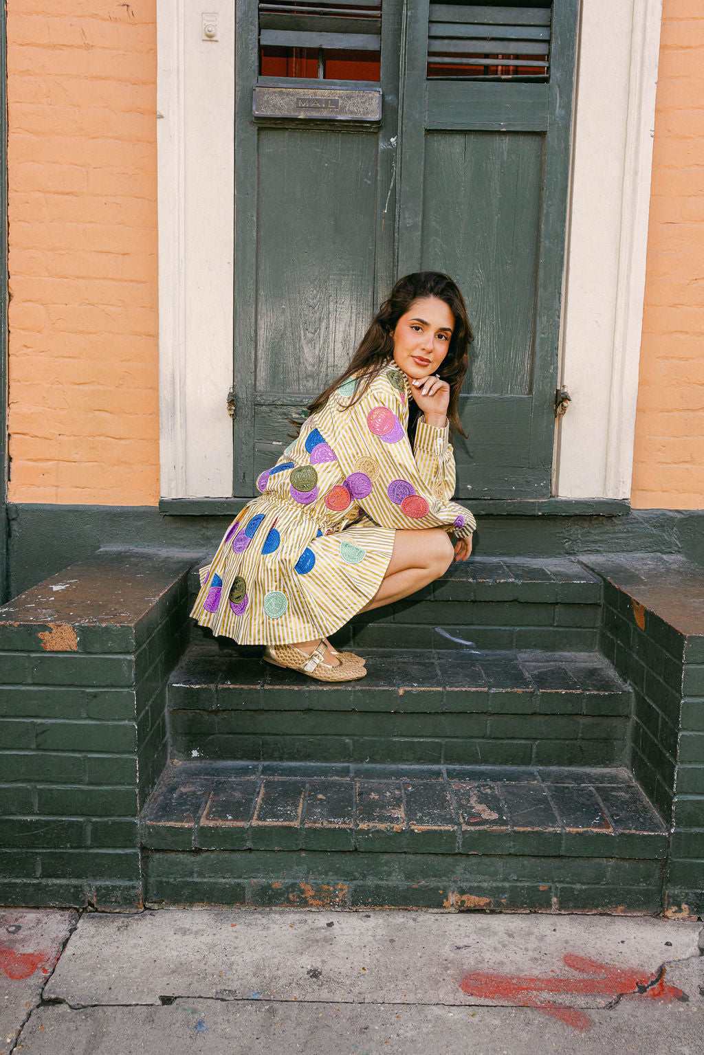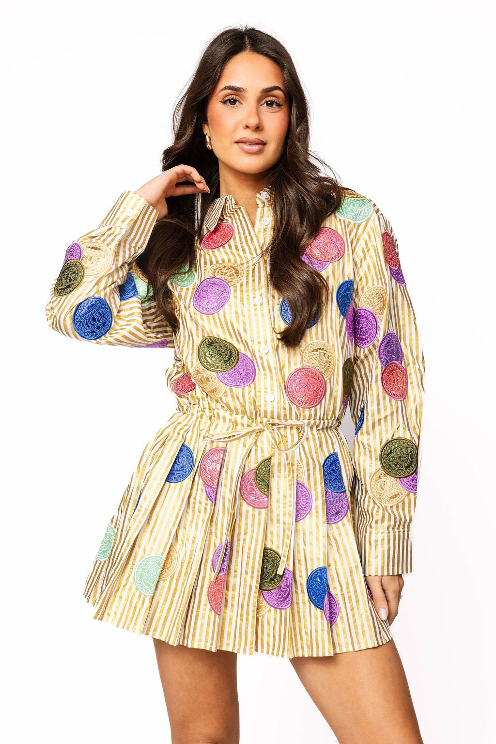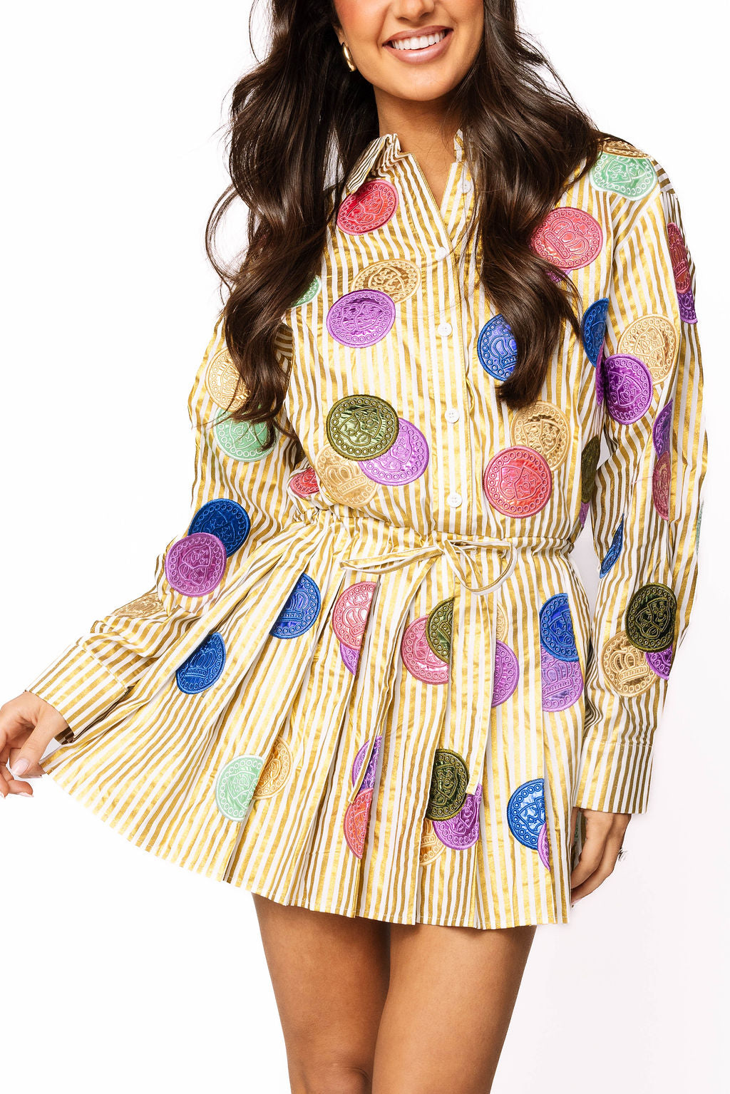 Make a statement in this dazzling striped dress that's equal parts chic and fun! The crisp gold and white stripes form the perfect canvas for a stunning multi-color doubloon design that adds instant personality. A flattering tie waist detail cinches your silhouette while long sleeves in soft cotton keep you cozy and stylish. Whether you're heading out for brunch or a night on the town, this dress delivers playful elegance with serious sparkle.