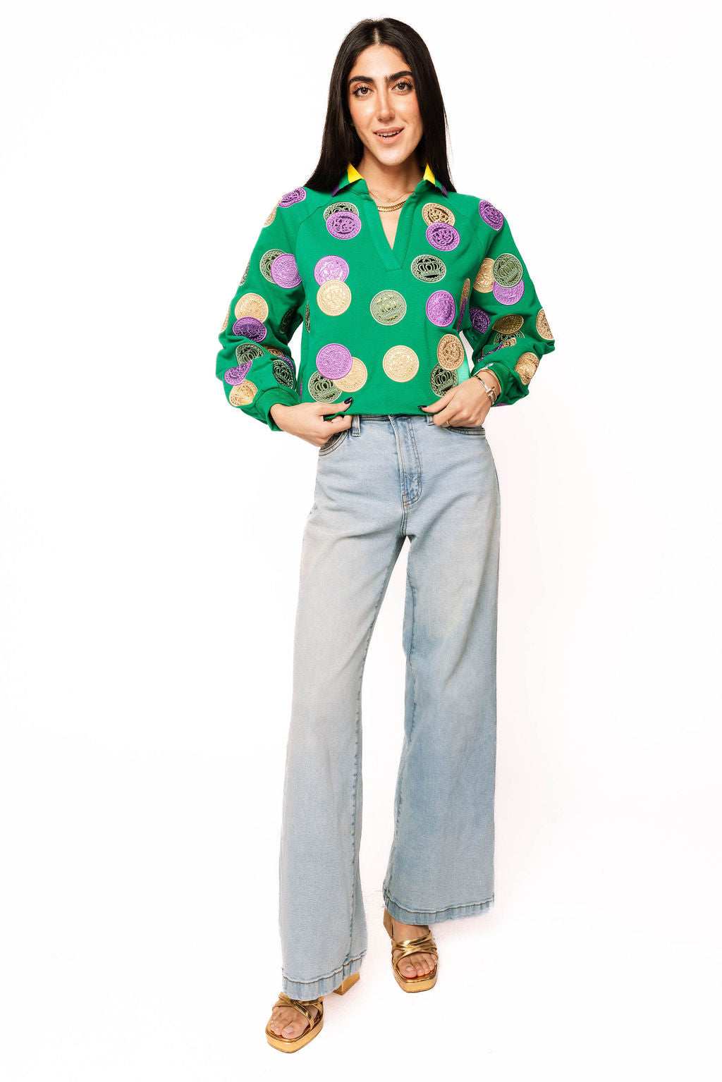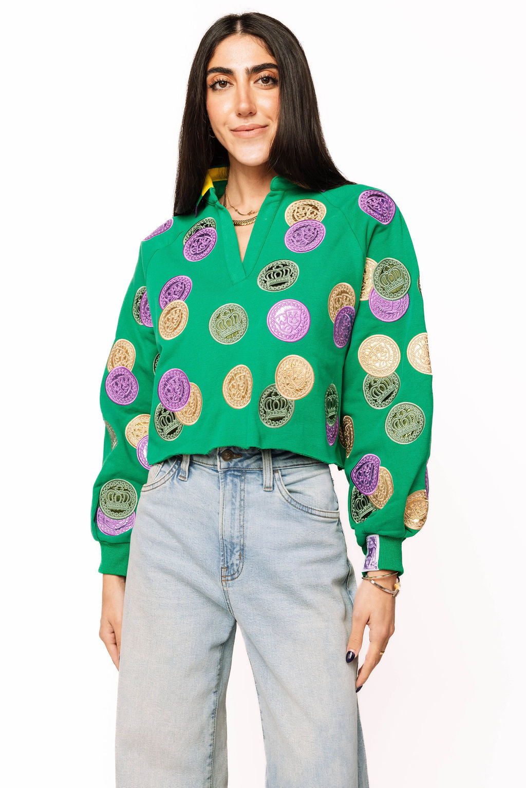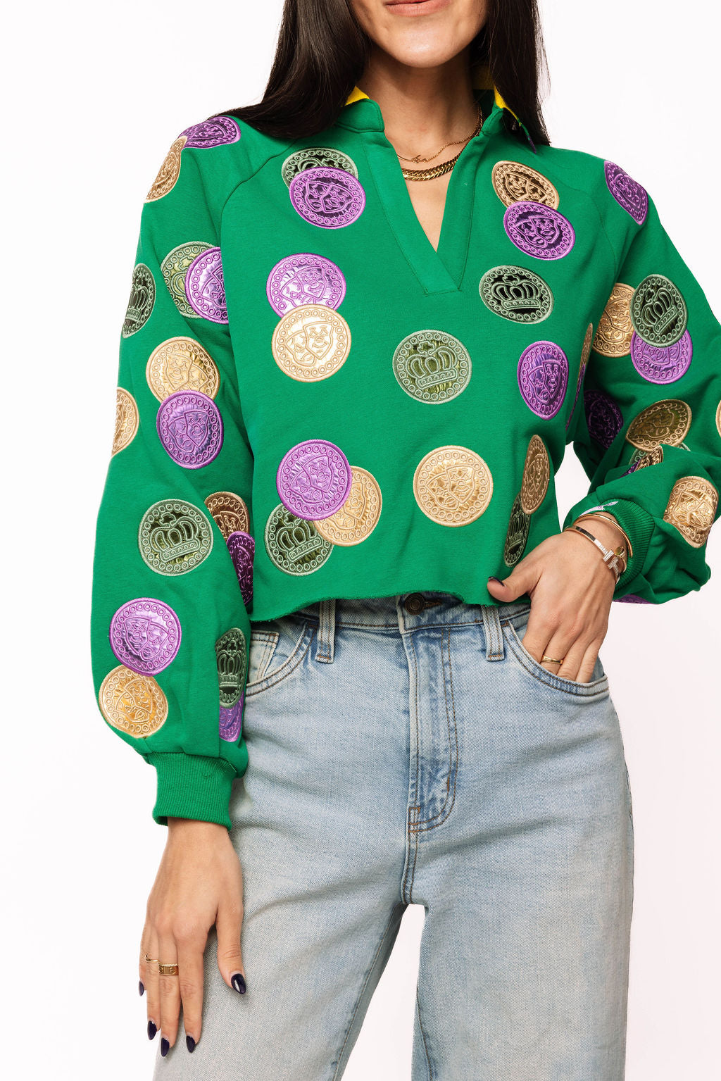 Get ready to celebrate in style with this vibrant green sweatshirt featuring a bold doubloon design in purple, gold, and green—the ultimate Mardi Gras essential. The eye-catching yellow collar adds a pop of contrast that makes this piece impossible to miss. Perfect for parades, parties, or showing your festive spirit year-round, this playful sweatshirt combines comfort with carnival flair. Throw it on and let the good times roll!