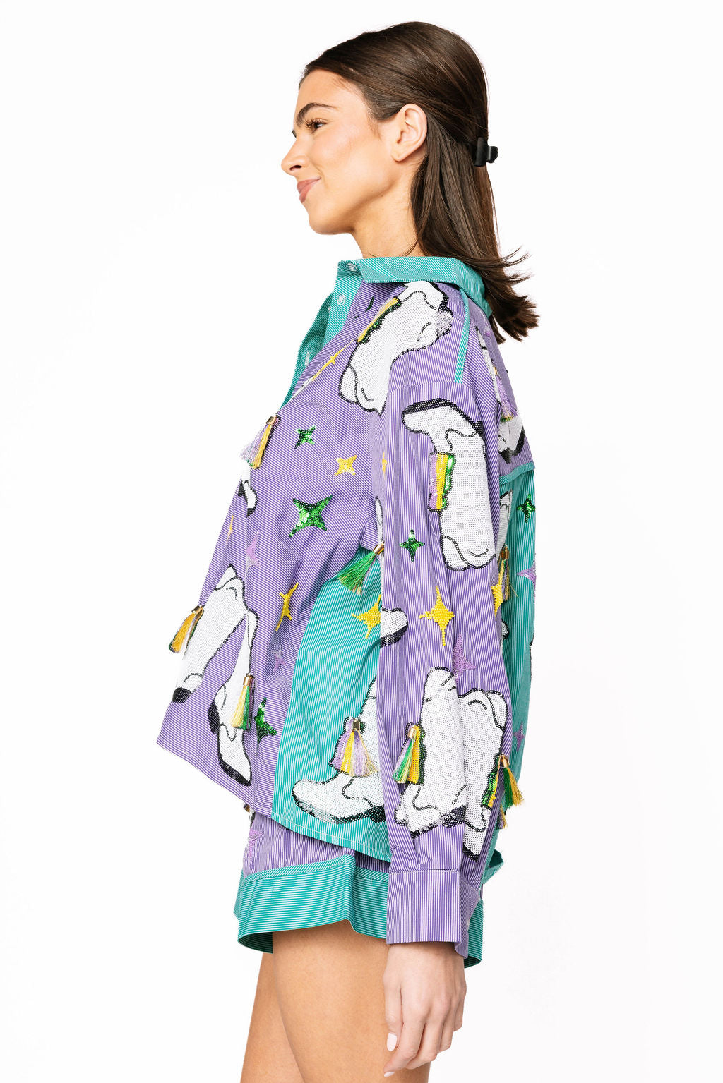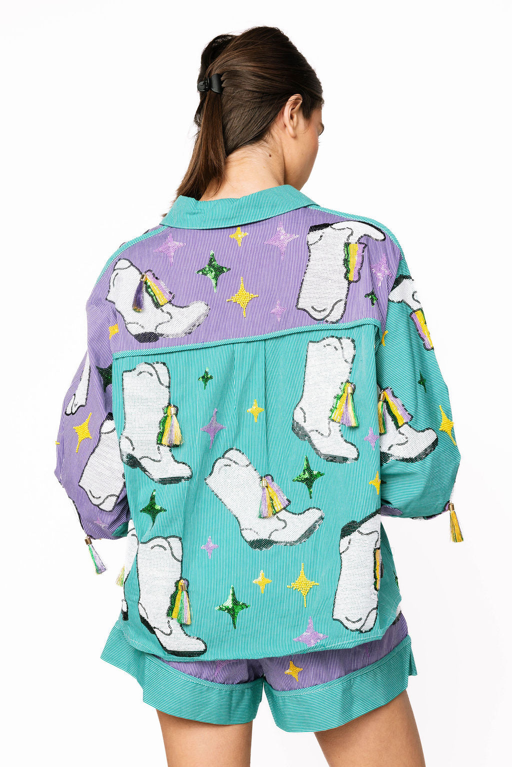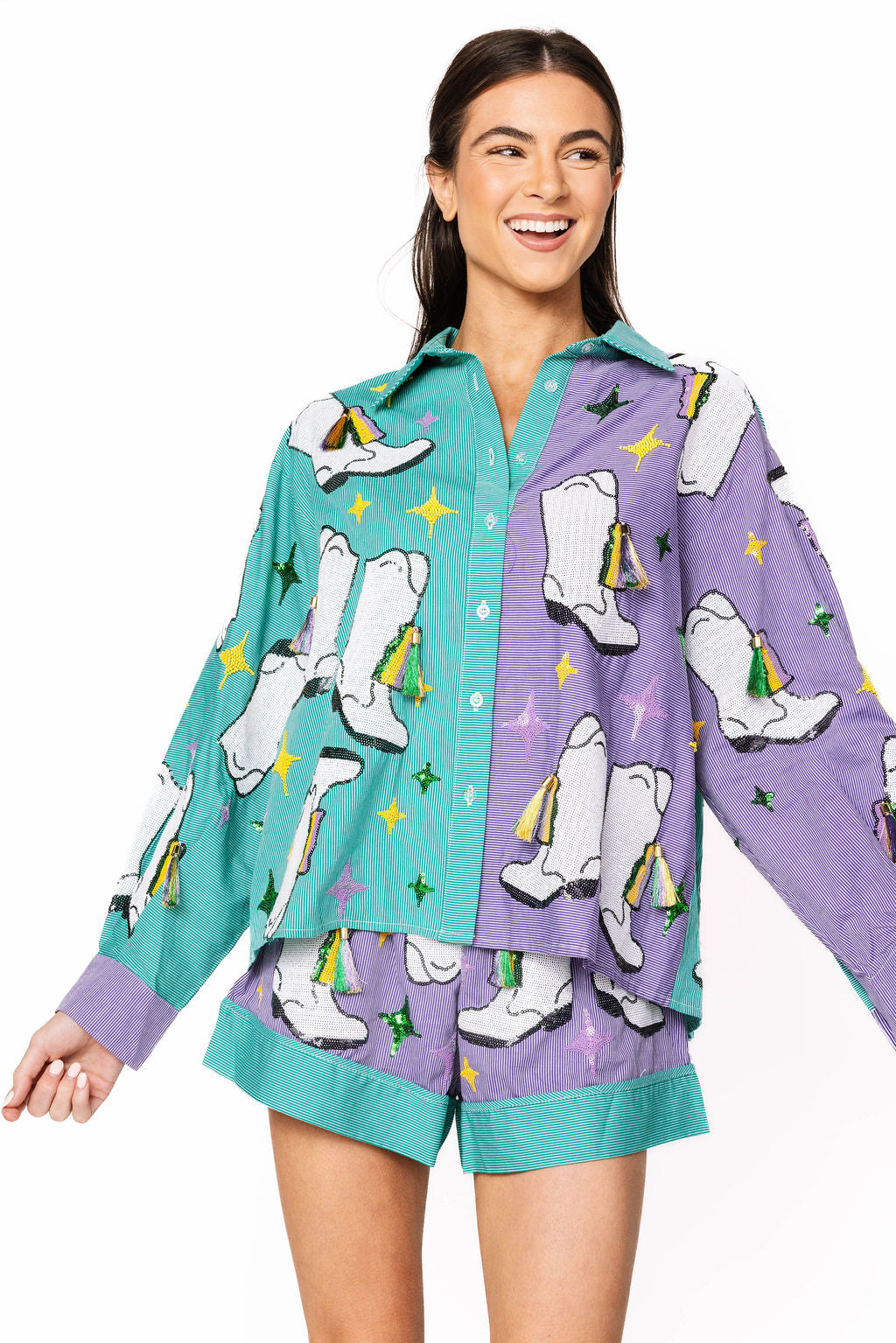 Get ready to turn heads this season with our Green & Purple Stripe Colorblock Mardi Gras Boot Button Up Collar Top! This playful piece features a vibrant color-blocked design in festive green and purple stripes, complete with an eye-catching Mardi Gras boot graphic. The real tassels add authentic flair and movement with every wear. Style it with our matching shorts for a coordinated look that's perfect for celebrations, parties, or whenever you want to bring the fun. A statement piece that celebrates bold color and spirited style!