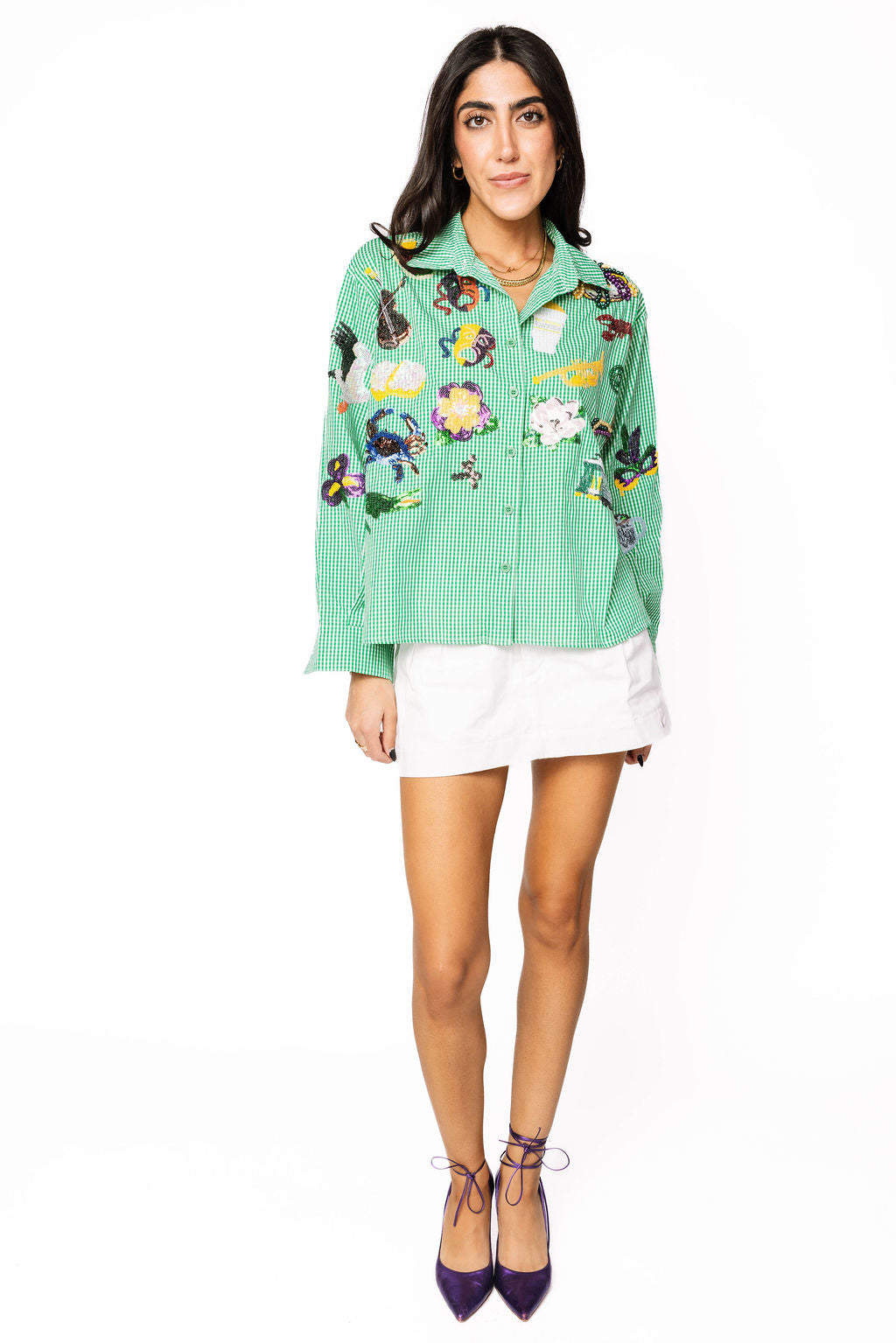 Green & White Gingham Mardi Gras Icon Button Up Cotton Top