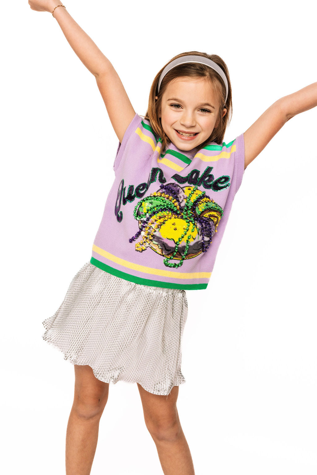 Elevate your sparkle game with this whimsical lavender top featuring bold green and yellow stripes and a dazzling sequin "queen cake" design. Perfect for making a statement, this playful piece brings fun and flair to any outfit.