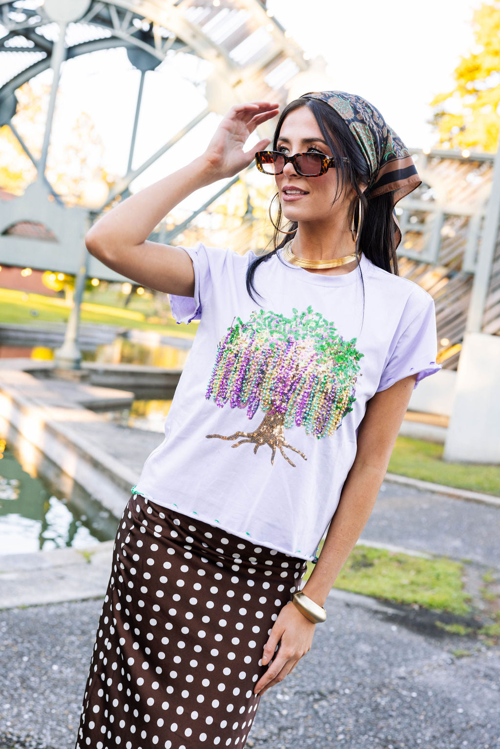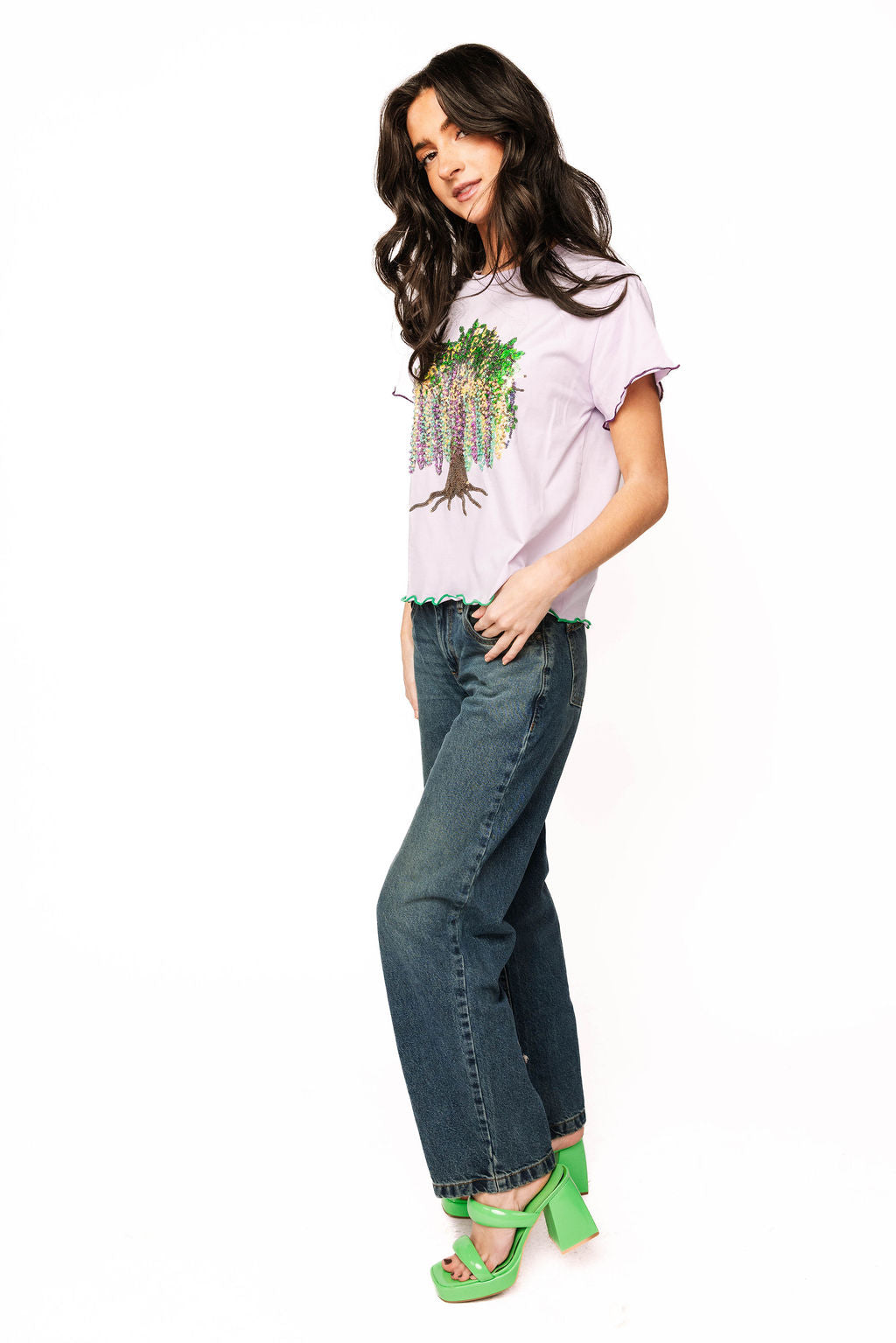 Twirl into sparkle mode with this lavender tee that's basically a wearable work of art! Delicate frill edges frame the neckline and sleeves for an extra touch of charm, while an enchanting tree design comes to life in shimmering full sequin beads. Perfect for anyone who believes more sparkle is always the answer. Whether you're heading to a festival, party, or just want to add some magic to your everyday look, this tee delivers personality and pizzazz in one gorgeous package.