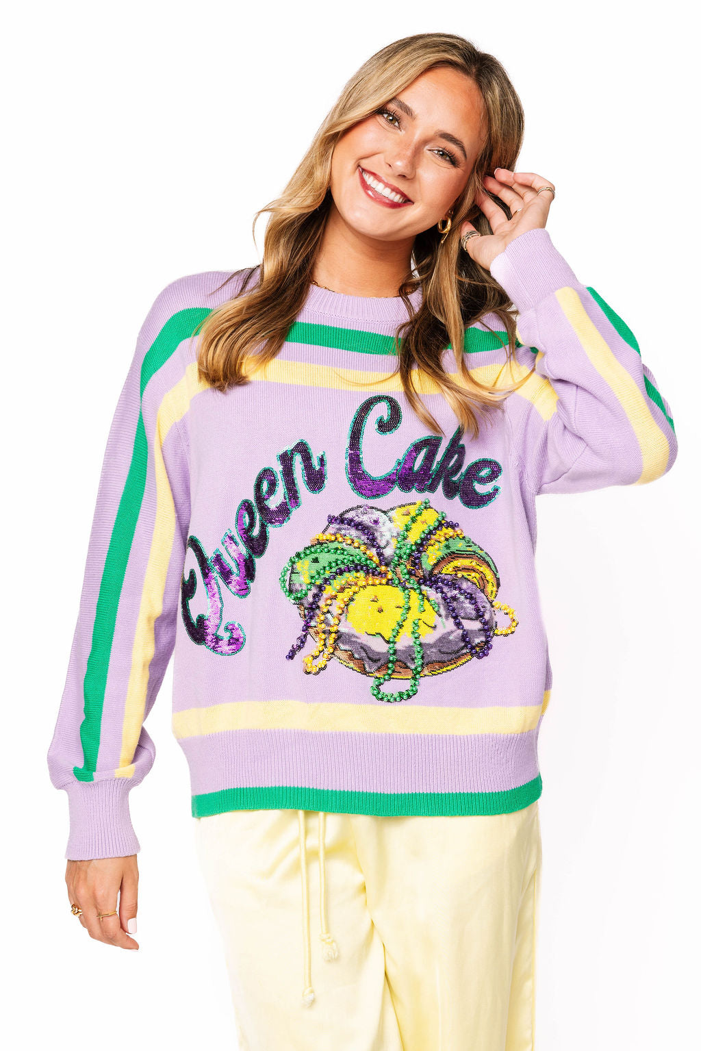 Elevate your sparkle game with this whimsical lavender sweater featuring bold green and yellow stripes and a dazzling sequin "queen cake" design. Perfect for making a statement, this playful piece brings fun and flair to any outfit. Style it with the matching skirt to create a coordinated, head-turning ensemble that celebrates your inner royalty. Whether you're hitting the town or turning heads at an event, this striped stunner delivers personality and pizzazz in every wear.