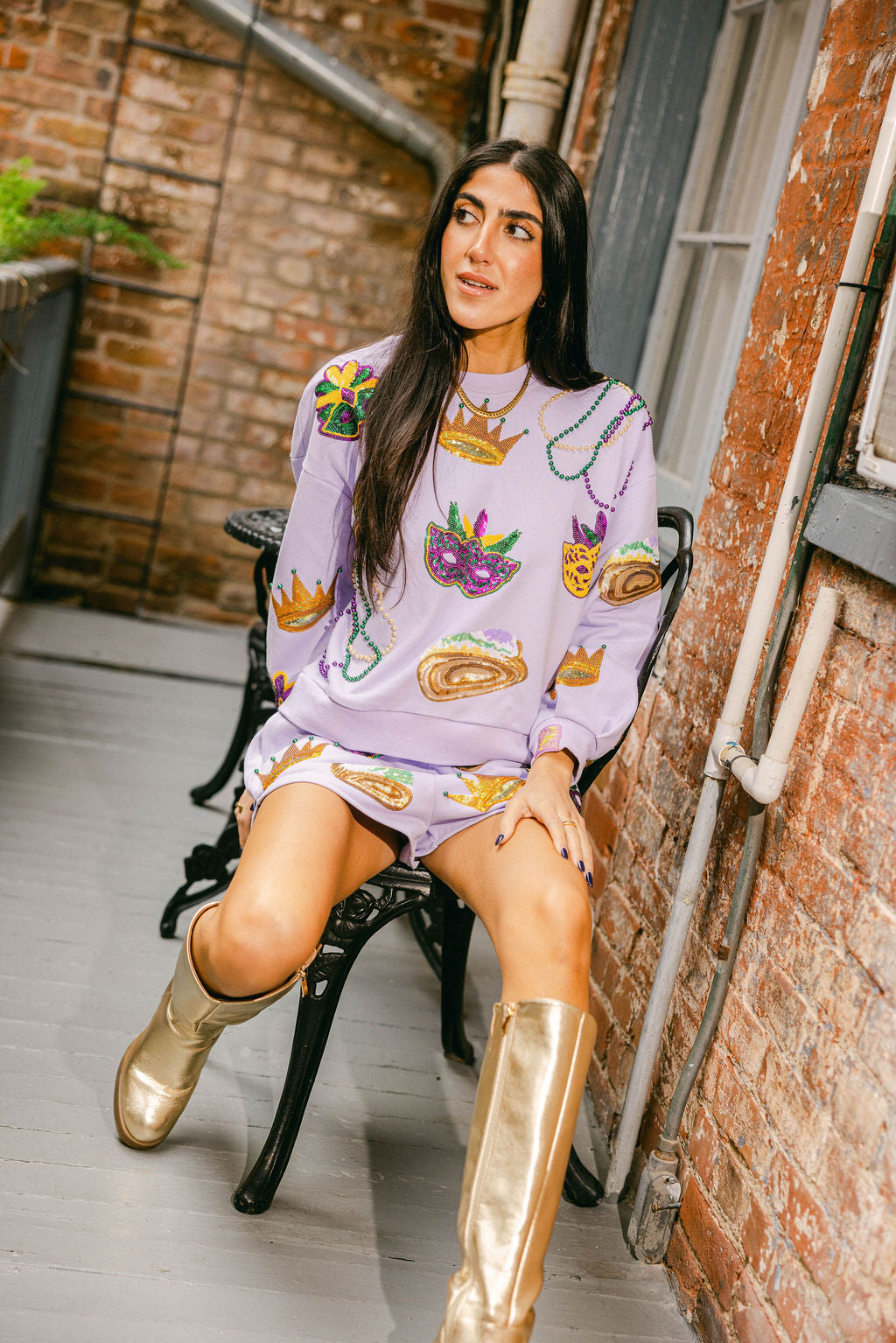 Get ready to turn heads in this lavender sweatshirt adorned with shimmering sequin Mardi Gras icons! Perfect for celebrating in style, the eye-catching embellishments catch the light with every move. Mix and match with our coordinating shorts to create an unforgettable festival-ready ensemble that screams fun and flair. Whether you're hitting the parade or bringing the party vibes anywhere, this playful piece is your ticket to sparkly, festive fashion that stands out from the crowd.